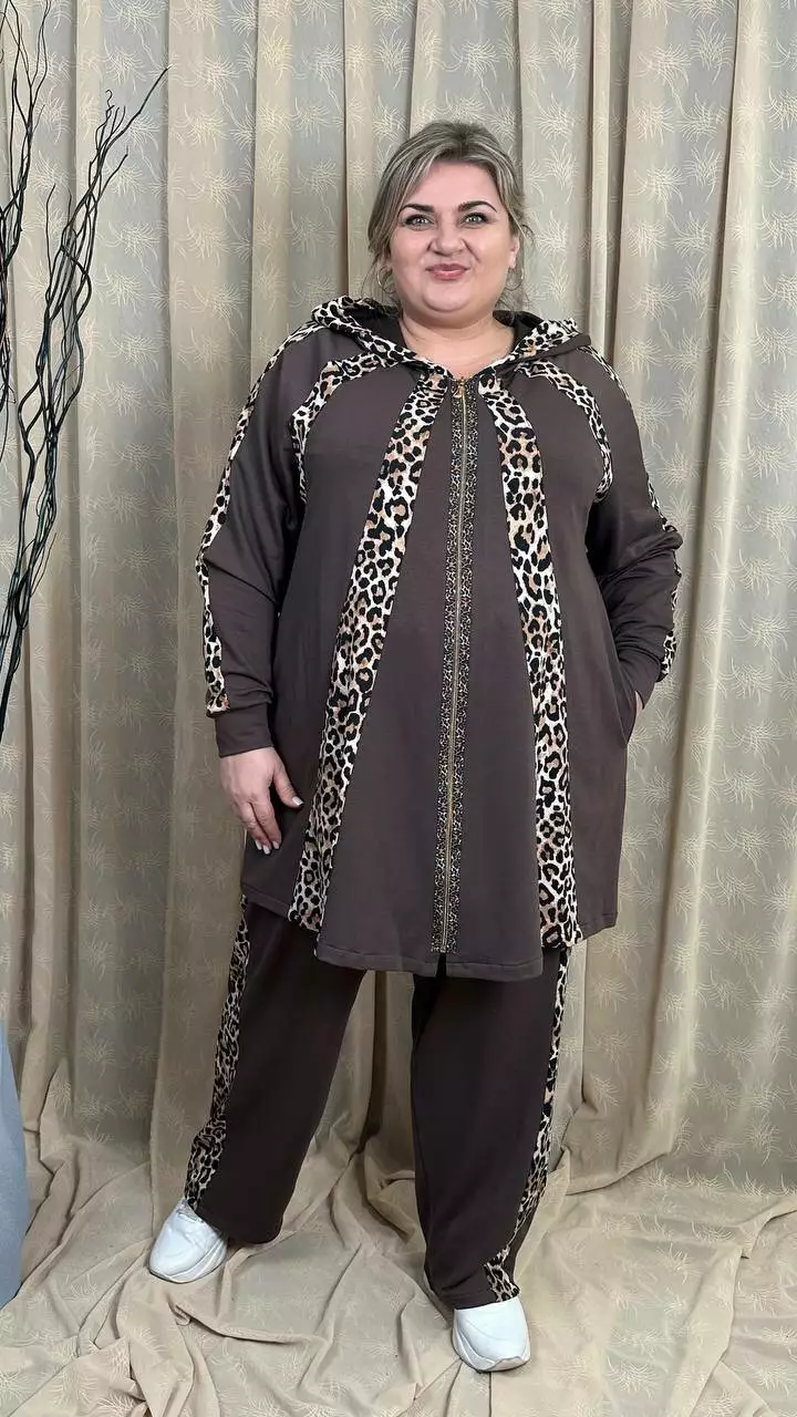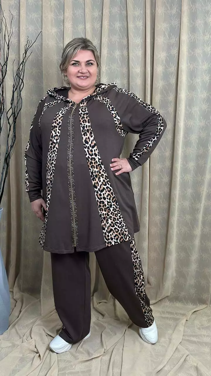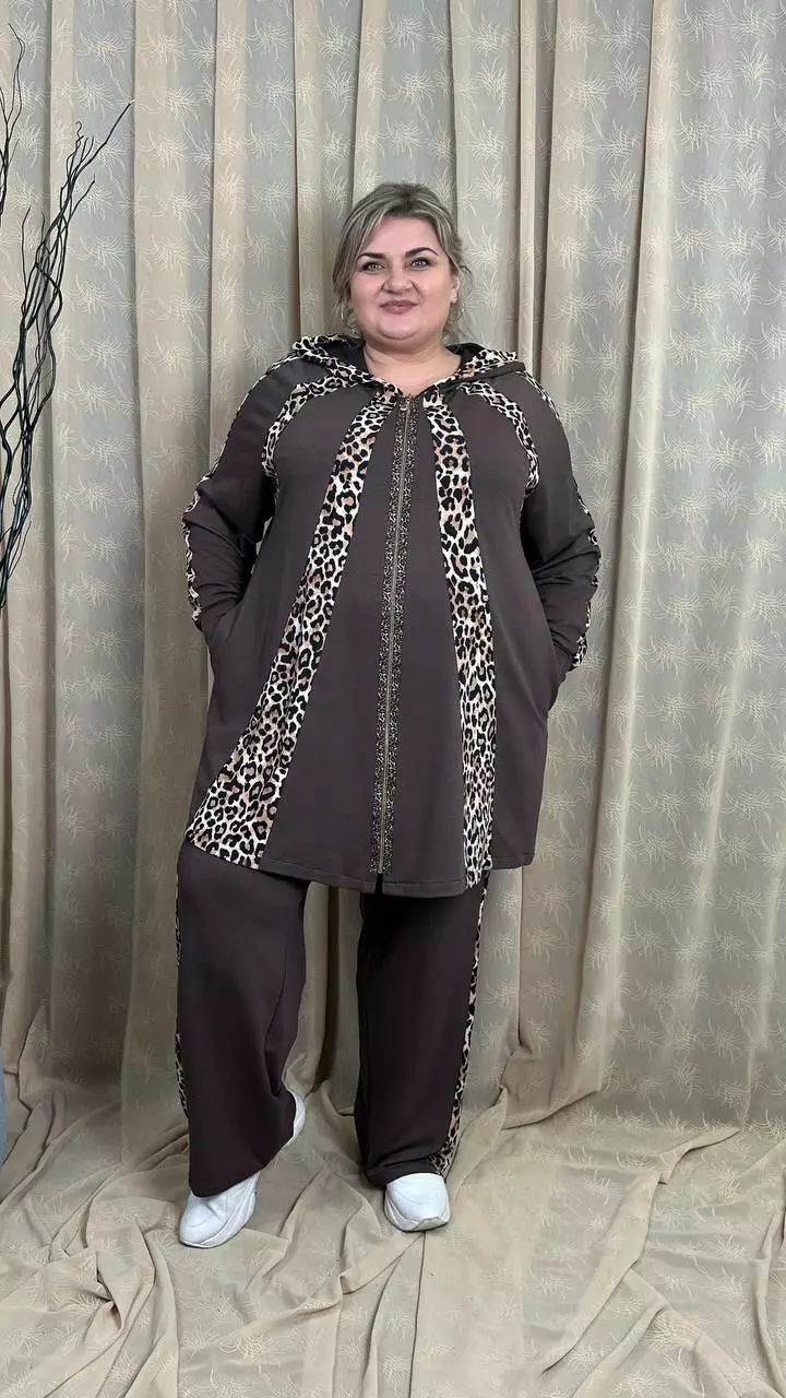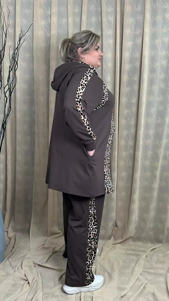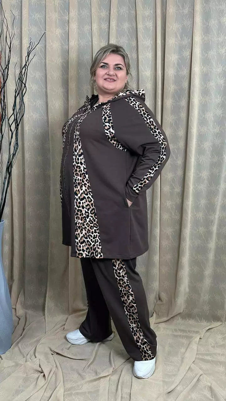 Костюм із трикотажу двонитка, відмінної якості. Кофта клешена донизу, рукав реглан, кишені в бічних швах. Штани вільні з лампасами, без кишень, висока посадка, пояс на гумці.