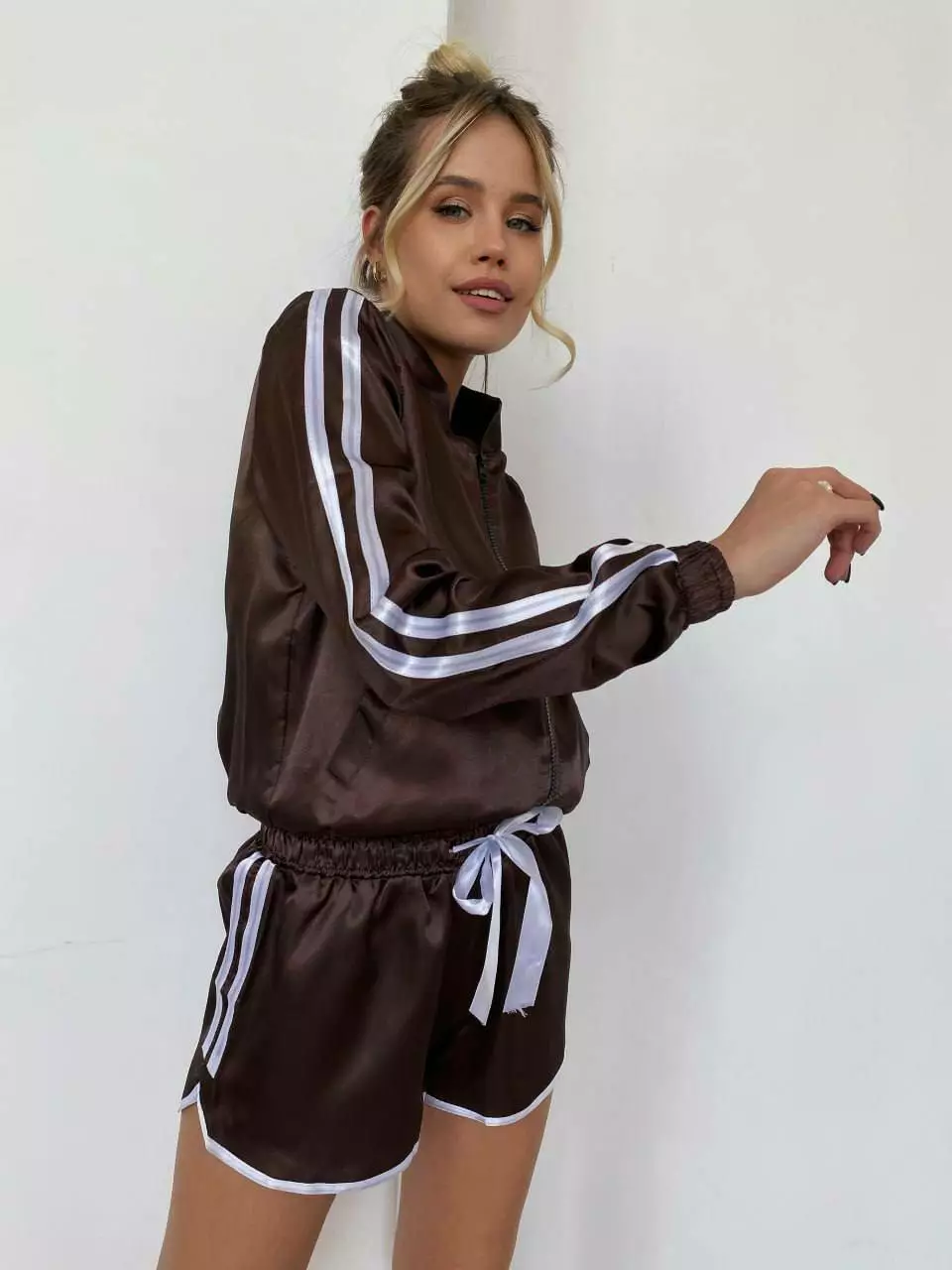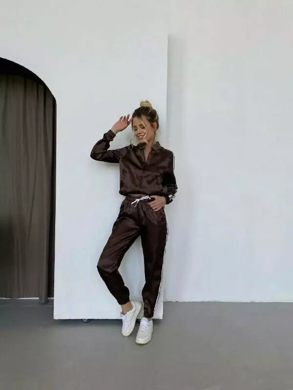 Костюм Трійка Тканина: атлас LUX Розмір: S/M, M/L Комплект: штани, шорти, кофта Кольори: сірий, бузок, шоколад