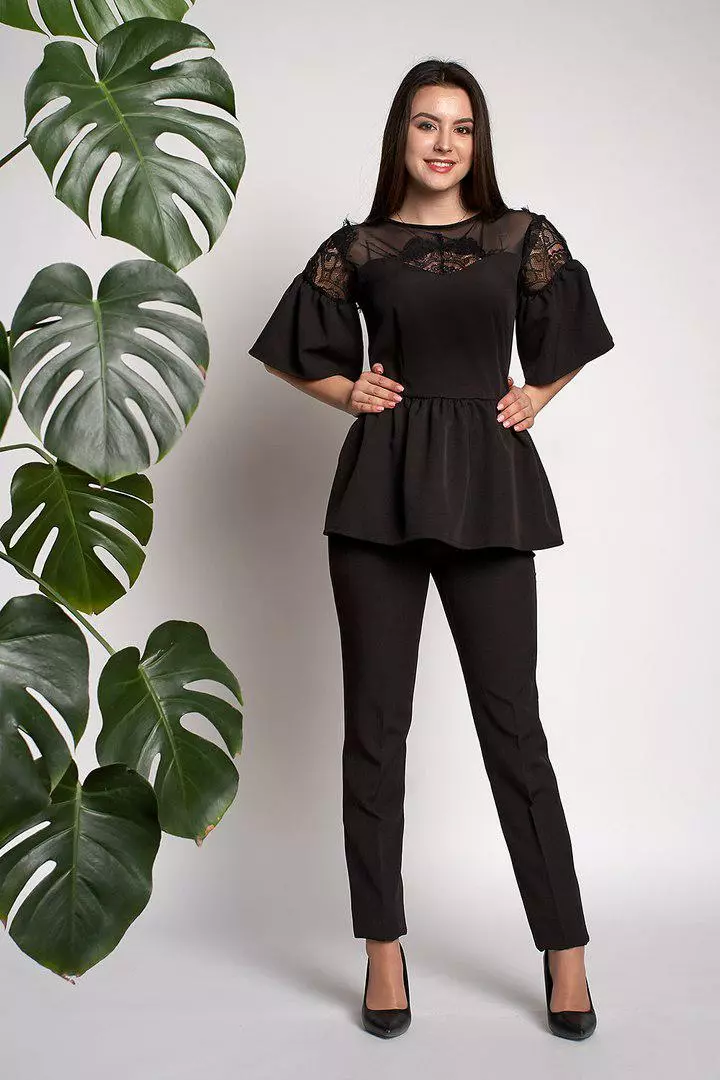Ультрамодный женский костюм Вилоу выполнен из ткани креп-костюмка высокого качества. Блуза свободного покроя с баской, рукава красивые воланы расклешонной  формы, гипюровая вставка украшает зону декольте. Брюки на высокой посадке, зауженные, с идеально отутюженными стрелками.  Костюм красиво ложится по фигуре, скрывает не достатки или подчеркивает достоинства, Вы будите себя чувствовать уютно и красиво. Такой костюм можно одеть на любое торжество, идеально смотрится с туфлями-лодочками.