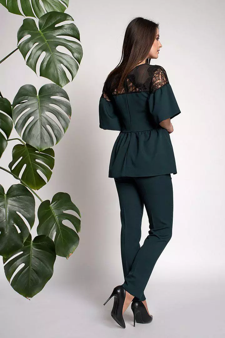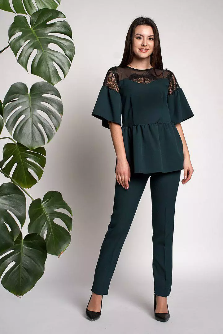Ультрамодный женский костюм Вилоу выполнен из ткани креп-костюмка высокого качества. Блуза свободного покроя с баской, рукава красивые воланы расклешонной  формы, гипюровая вставка украшает зону декольте. Брюки на высокой посадке, зауженные, с идеально отутюженными стрелками.  Костюм красиво ложится по фигуре, скрывает не достатки или подчеркивает достоинства, Вы будите себя чувствовать уютно и красиво. Такой костюм можно одеть на любое торжество, идеально смотрится с туфлями-лодочками.