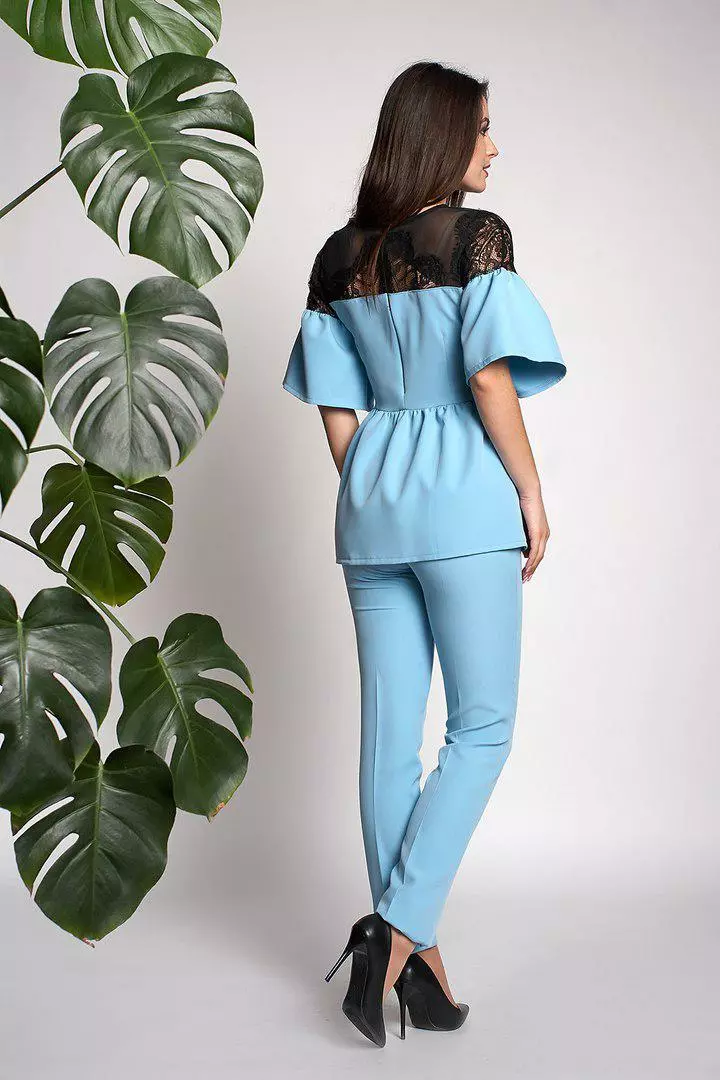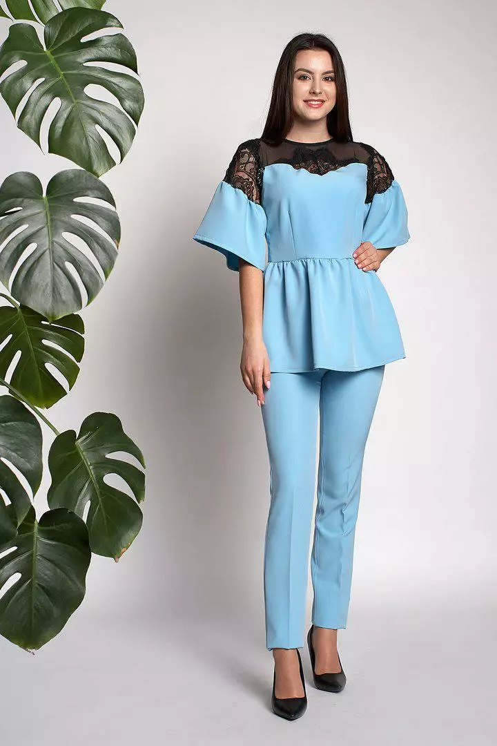 Ультрамодный женский костюм Вилоу выполнен из ткани креп-костюмка высокого качества. Блуза свободного покроя с баской, рукава красивые воланы расклешонной  формы, гипюровая вставка украшает зону декольте. Брюки на высокой посадке, зауженные, с идеально отутюженными стрелками.  Костюм красиво ложится по фигуре, скрывает не достатки или подчеркивает достоинства, Вы будите себя чувствовать уютно и красиво. Такой костюм можно одеть на любое торжество, идеально смотрится с туфлями-лодочками.