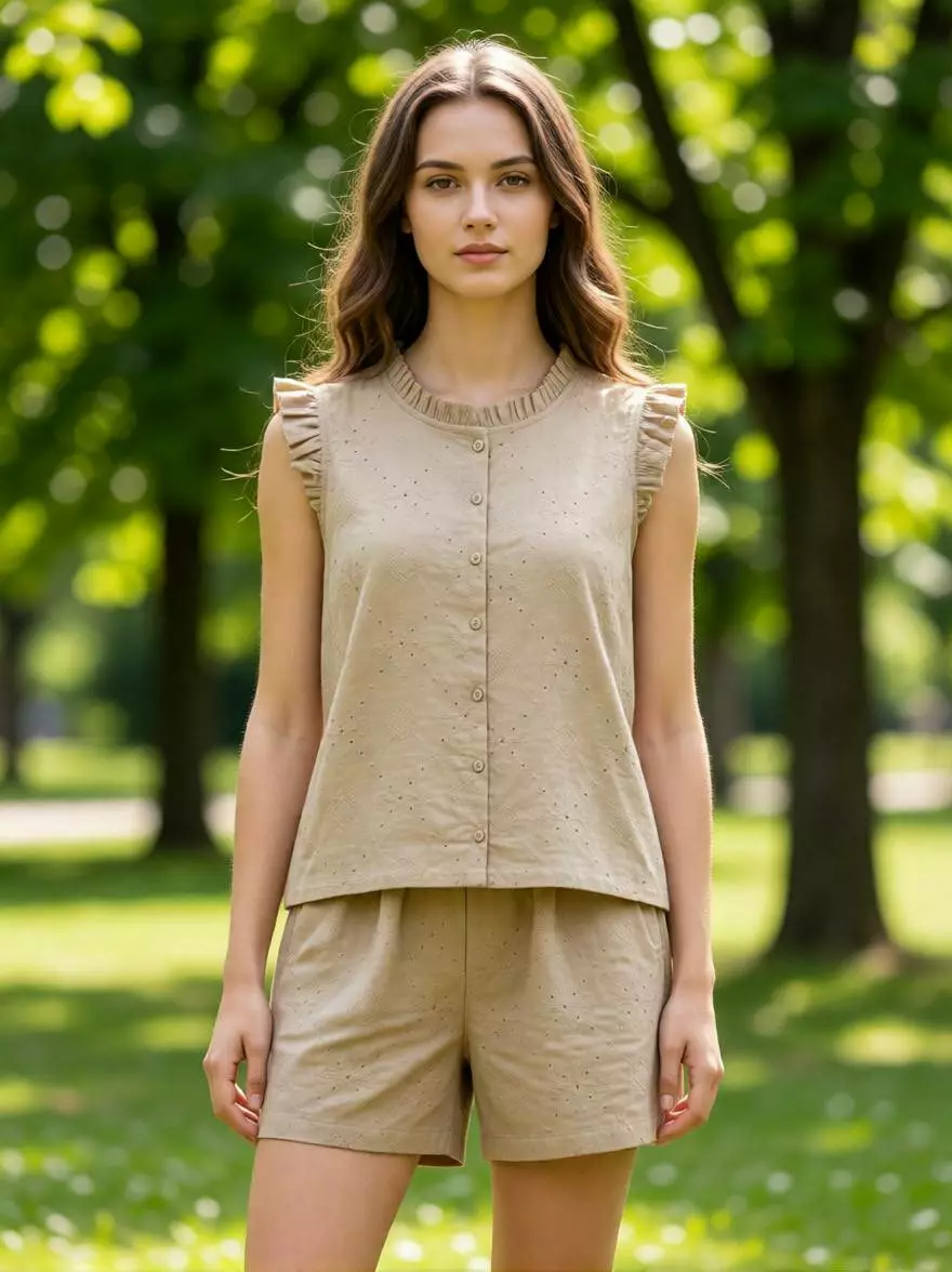 Витончений та затишний літній костюм-двійка з натуральної тканини в ніжному бежевому кольорі. Ця модель поєднує в собі спокій відтінку та грайливість ажурного візерунка, створюючи неповторний образ для будь-якої ситуації.