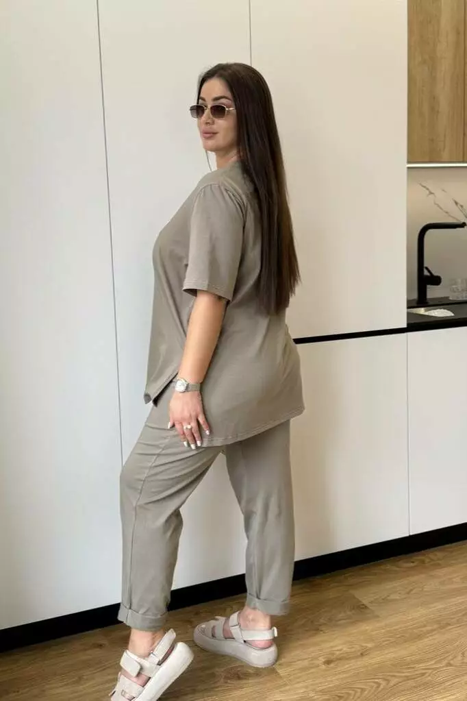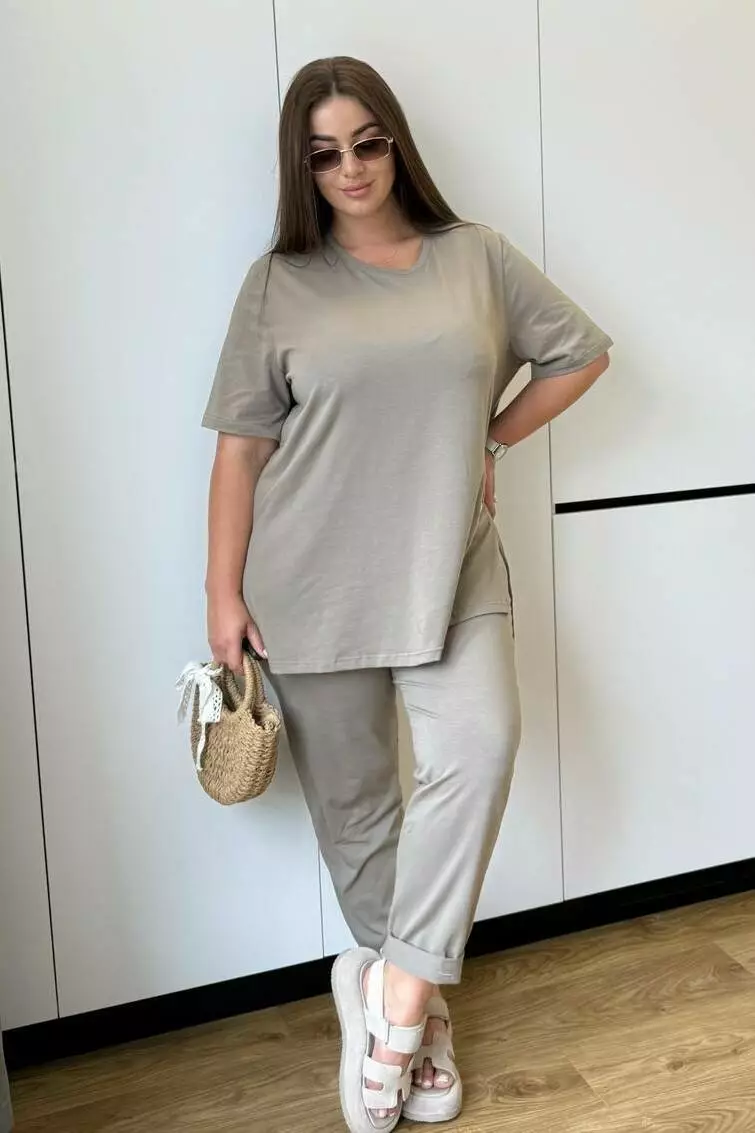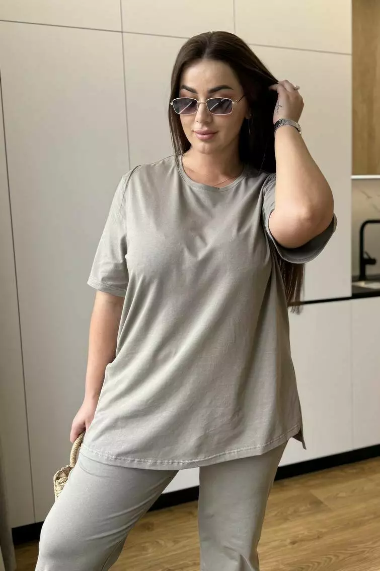Костюм жіночий літній: штани з кишенями та футболка з розрізами й