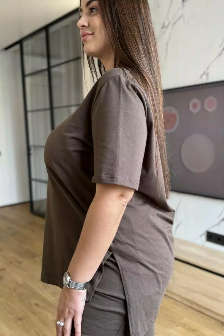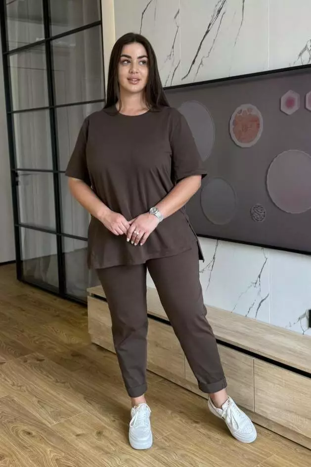 Костюм жіночий літній: штани з кишенями та футболка з розрізами й