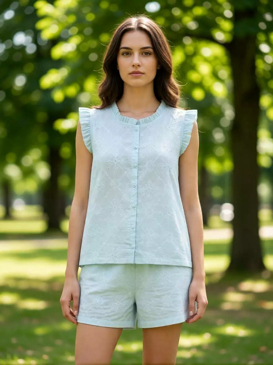 Деталі: Блуза без рукавів з грайливими рюшами на плечах та горловині, застібається на ґудзики. Шорти вільного крою на комфортній гумці.
