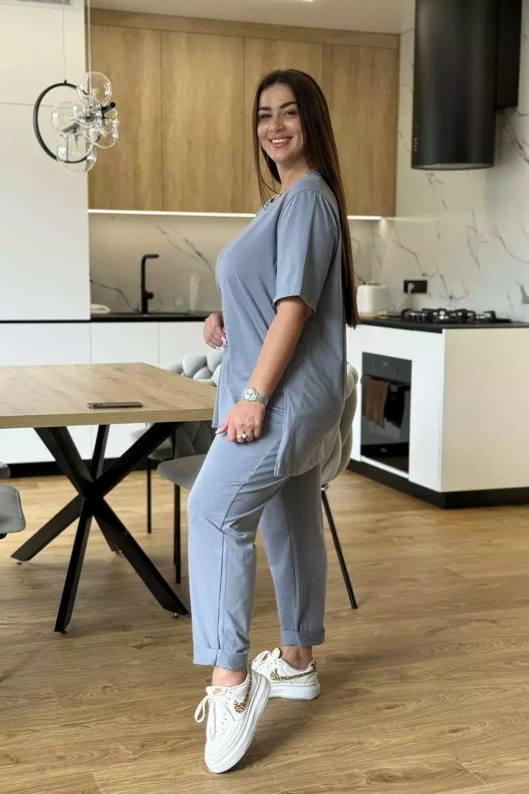 Костюм жіночий літній: штани з кишенями та футболка з розрізами й