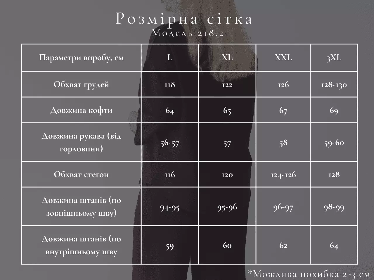 складається з вільної кофти з рукавом 3/4 та штанів прямого крою.