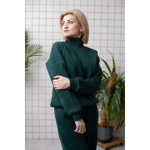 Комплект із світшота oversize з високою горловиною та вільних штанів. Виготовлений із щільного футеру-тринитки. Футер бавовна має м’який внутрішній начіс, що забезпечує тепло в прохолодну погоду. Еластичні манжети, пояс і трикотажна резинка на талії гарантують зручну посадку. Декоративні відстрочки на рукавах, спереду світшота та на штанинах додають виробу фактурності. Ідеально підходить для міжсезоння.