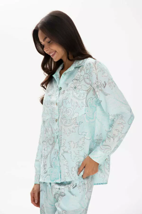 Ідеальне поєднання затишку та розкоші. Костюм із віскозного шовку з тонким жакардовим візерунком створена для жінок, які цінують комфорт і естетику. Легкий блиск тканини, шовковиста текстура та натуральні ґудзики з мушлі надають образу витонченості. Підходить для щоденного та святкового носіння