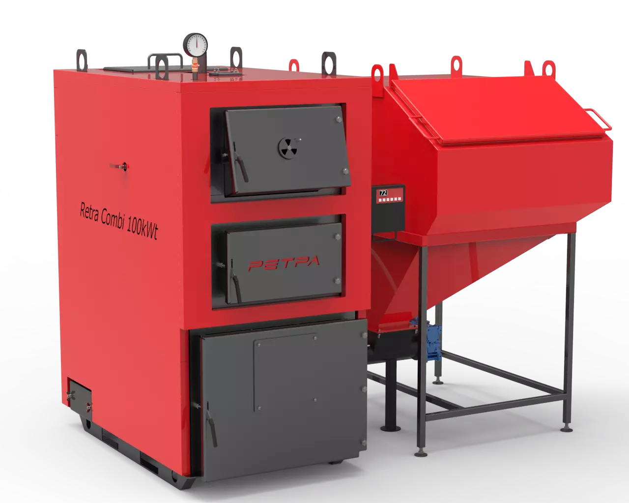 Демонтируется боковой люк котла, на место которого устанавливается ретортная горелка. Топливо подается из бункера с помощью шнека горелки, сгорания топлива проходит в нижней камере. Этот режим автоматической загрузки предназначен для сжигания пеллет и мелкого угля. Процесс горения контролирует блок управления. Питательный бункер для топлива защищен системой пожаротушения с термостатическим клапаном BVTS.