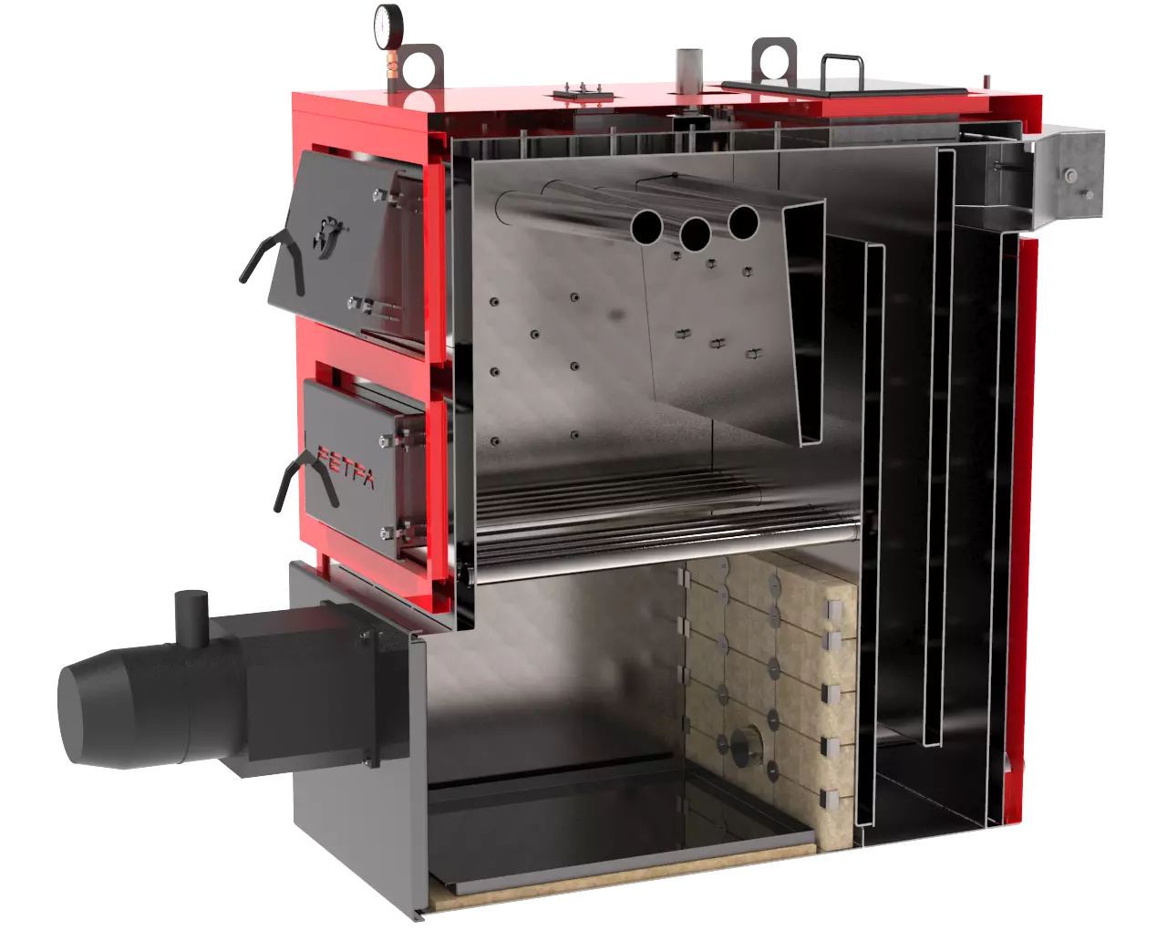 palnik retortВ нижний люк котла устанавливается факельная горелка, в которую механизировано подается топливо из бункера. Сгорание топлива проходит в нижней камере. Этот режим автоматической загрузки предназначен для сжигания пеллет (в том числе агропелет). Факел пеллетной горелки направлен на заднюю стенку топки котла с футеровкой. Процесс авторозжига, горения и очистки горелки контролирует многофункциональный блок управления. Механизированная подача топлива, бункер и автоматика поставляется в комплекте с факельной горелкой.
