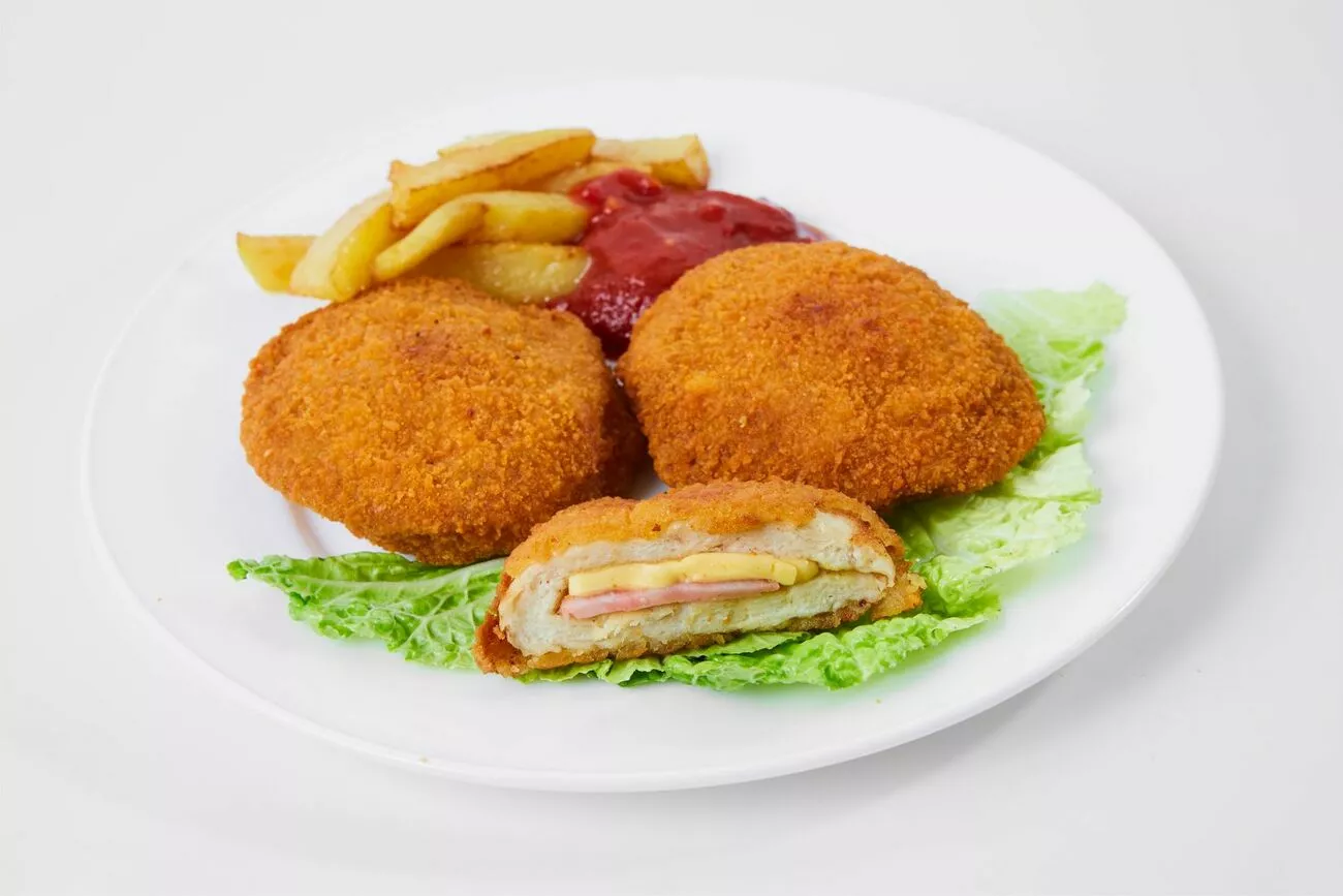 Состав: куриное мясо, лук, твердый сыр, ветчина вареная куриная, сухари панировочные, соль.