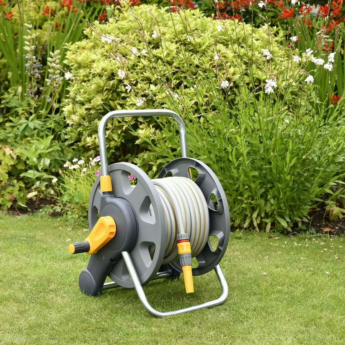 • Вміщує до 45 м шлангу. Завдяки зручній металевій рукоятці котушку