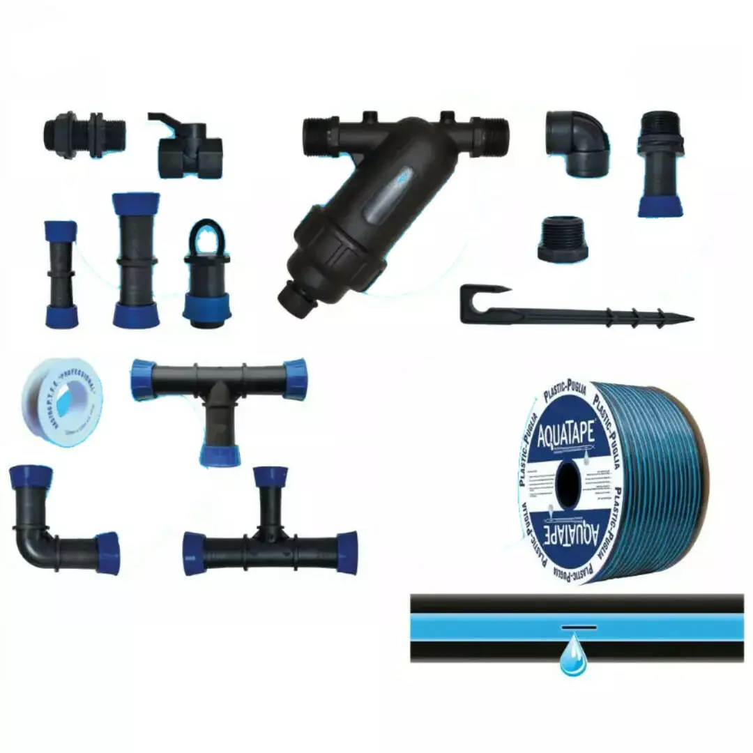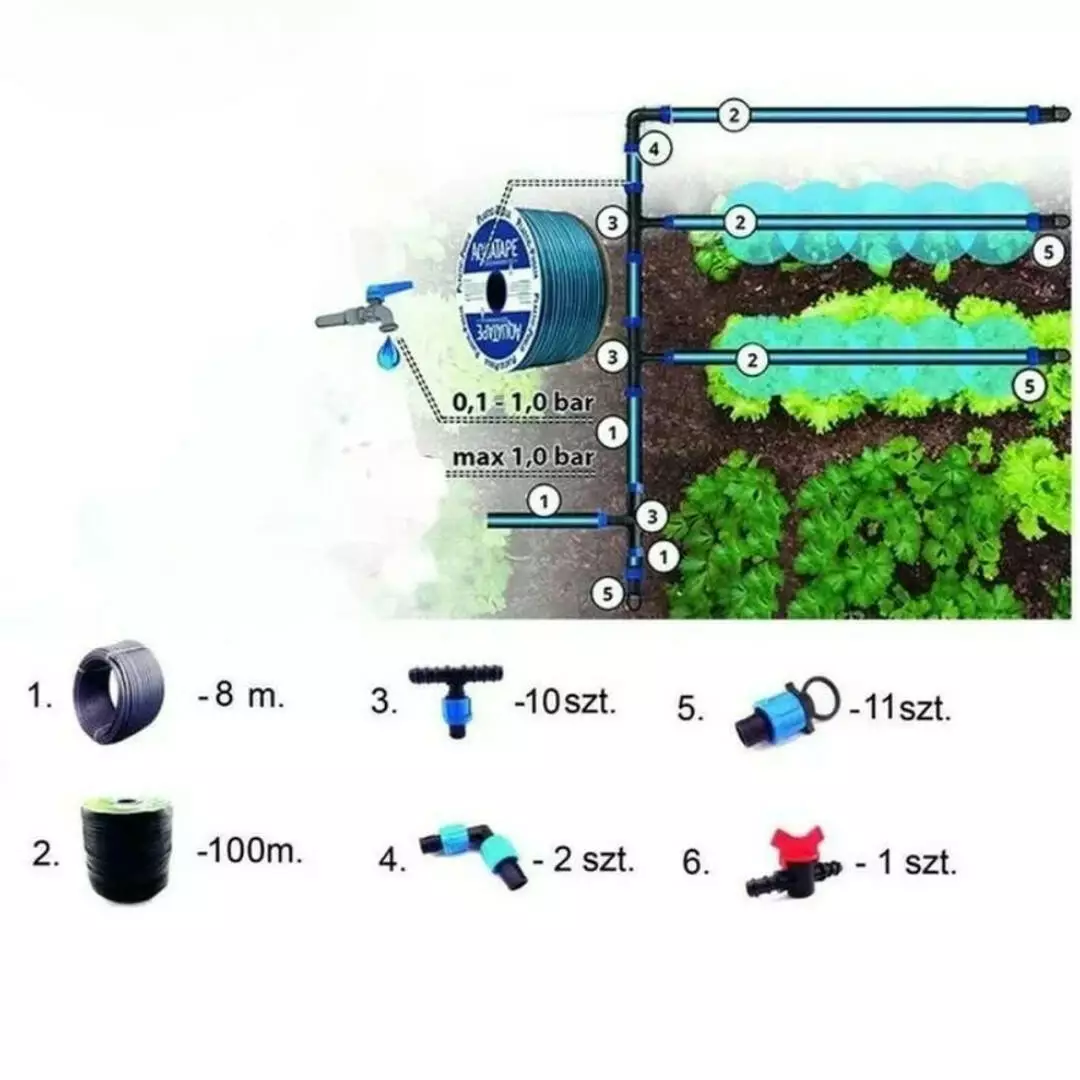 Набір легко встановлюється без спеціальних інструментів: досить під'єднати магістральний шланг до джерела води — до крана або бака — і розкласти крапельну стрічку вздовж грядок. Стабільний потік води навіть за низького тиску забезпечує рівномірне зволоження всієї площі, а ремонтні фітинги дають змогу швидко усунути пошкодження елементів.