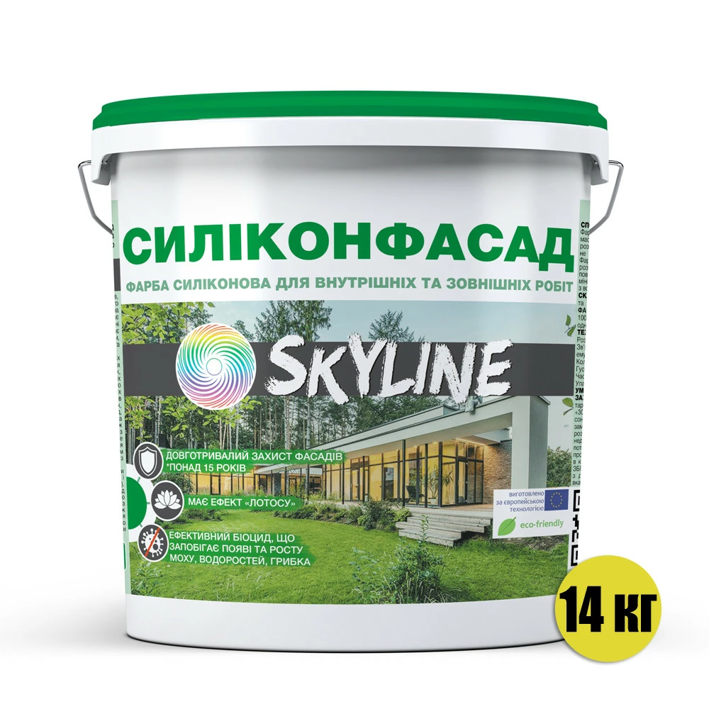 Краска фасадная на силиконовом связующем Силиконфасад SkyLine (СкайЛайн) для окрашивания преимущественно снаружи, а также внутри помещений в качестве износостойкого декоративно-защитного покрытия на максимально длительный срок.