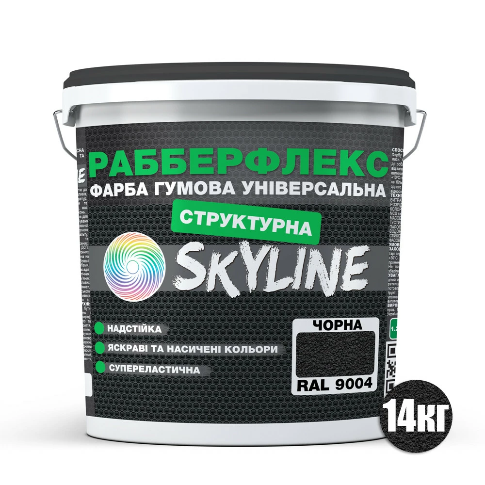Краска резиновая *Структурная* универсальная «РабберФлекс» СкайЛайн (RubberFlex SkyLine)  для применения снаружи и внутри помещений, обладающая повышенной стойкостью к механическим и атмосферным воздействиям, выдерживает любые перепады температур, стойкая к воздействию ультрафиолета и инфракрасного излучения. Обладает высокой паропроницаемостью. Приятна в работе, легко наносится, не растекается и не разбрызгивается. Имеет насыщенную однородную консистенцию. Высокоэластичный материал с отличной адгезией к любым поверхностям.