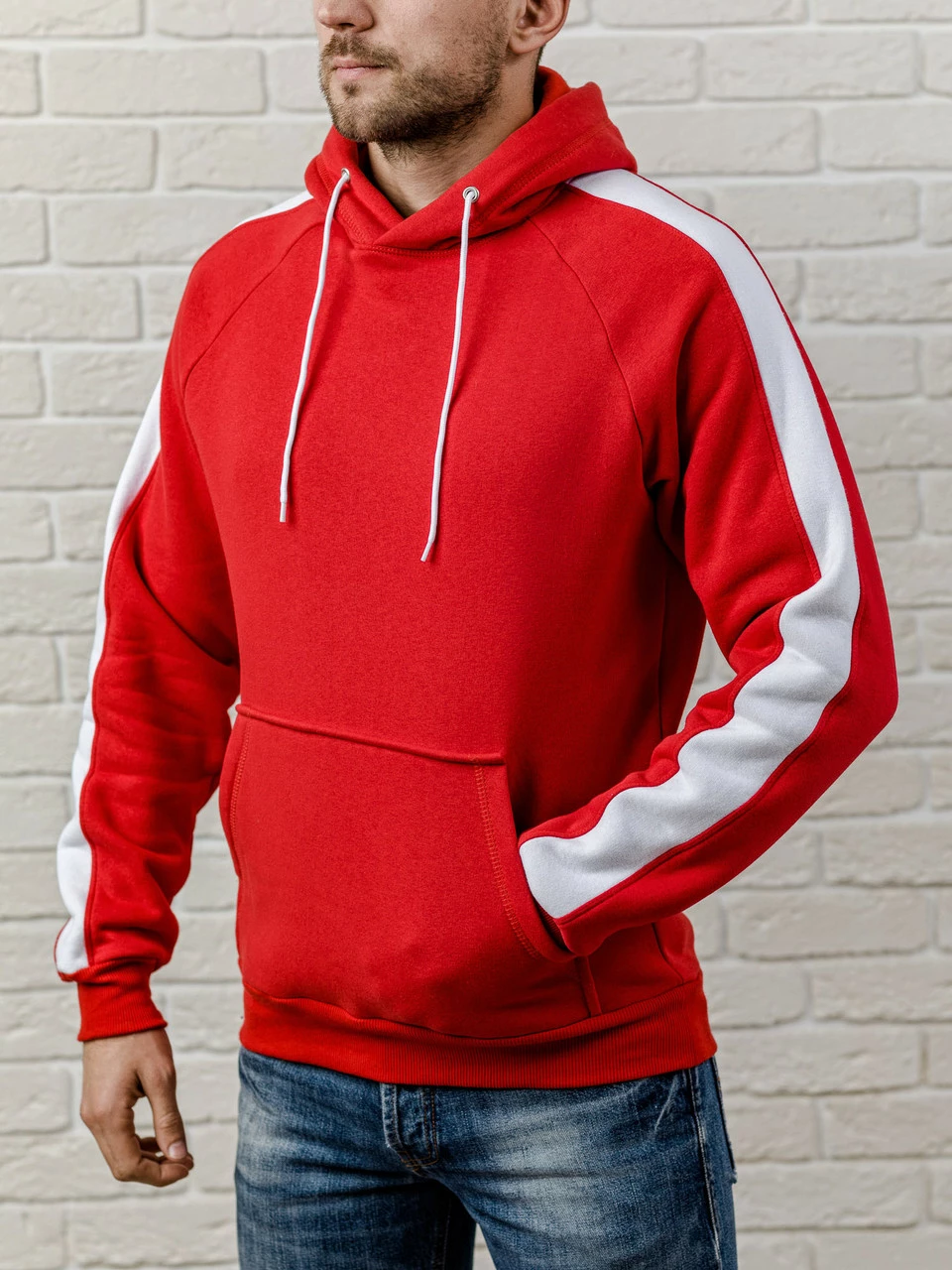 Красная мужская толстовка с капюшоном, теплая худи с лампасами, кофта, кенгурушка / ОСЕНЬ-ЗИМА