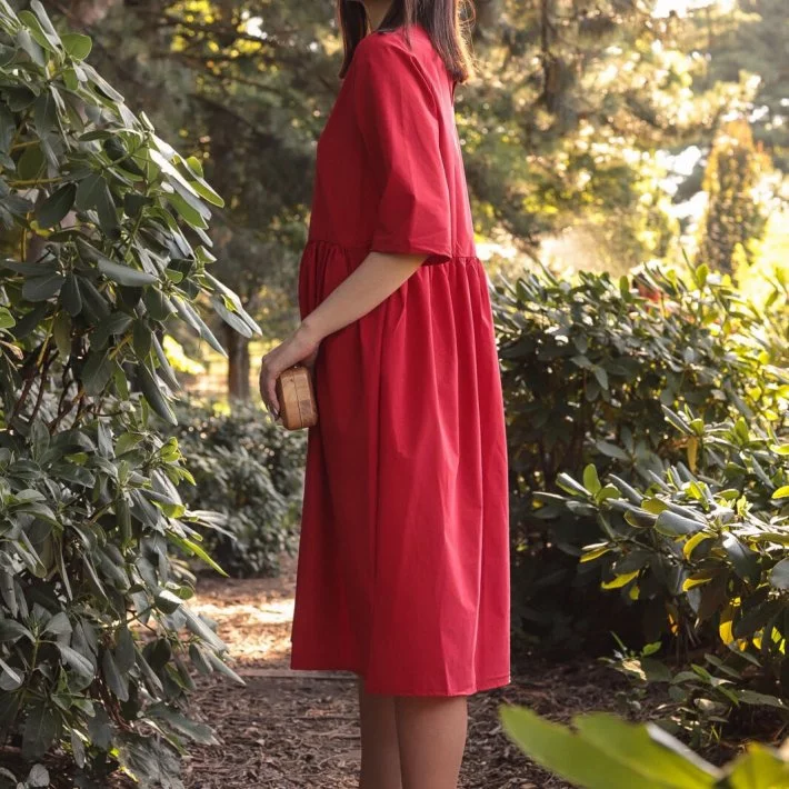 Сукня-трапеція вільного крою із збіркою по талії. При пранні