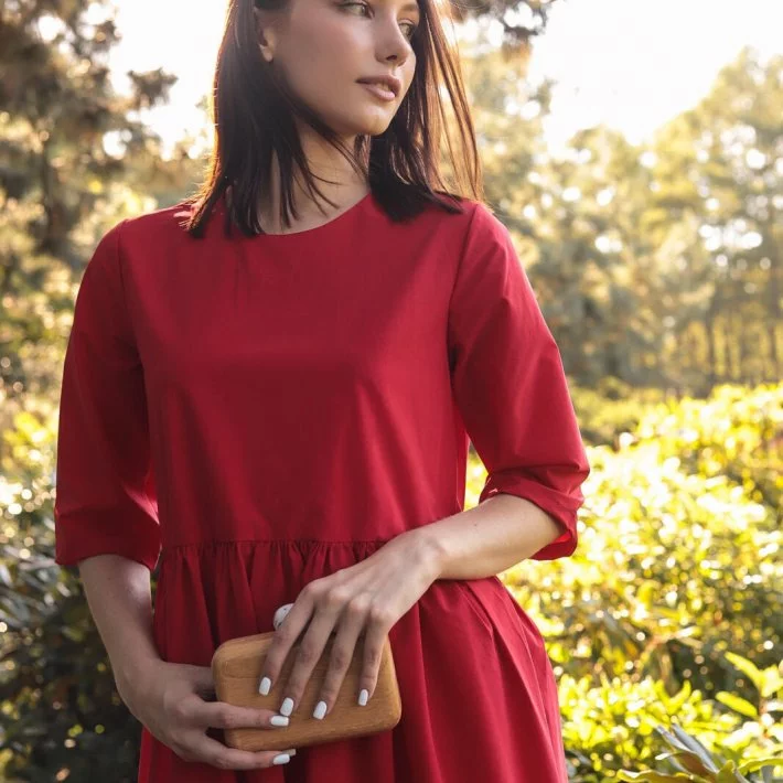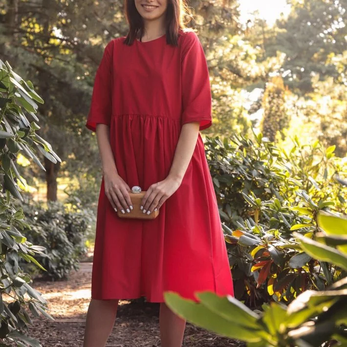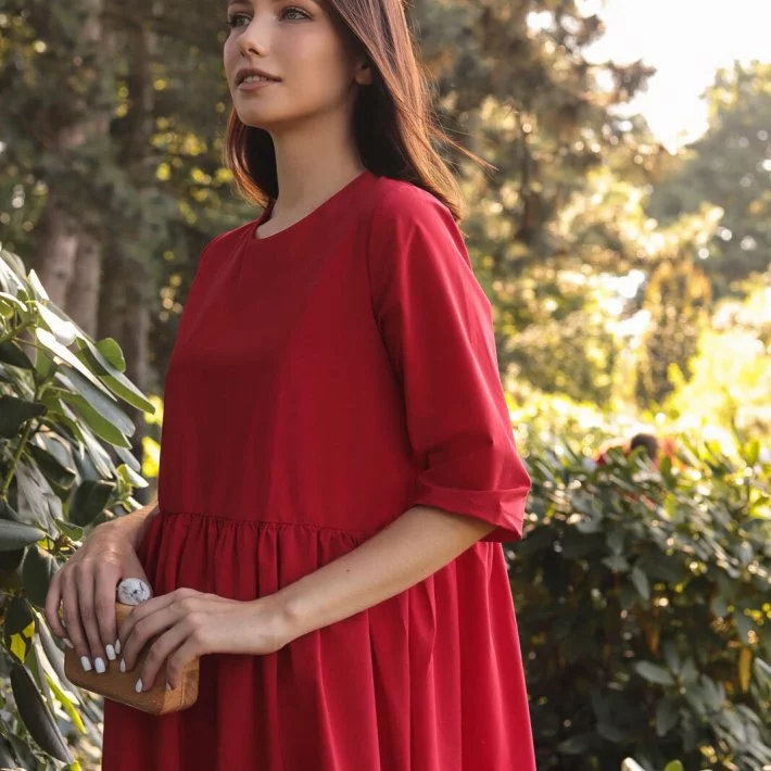 Сукня-трапеція вільного крою із збіркою по талії. При пранні
