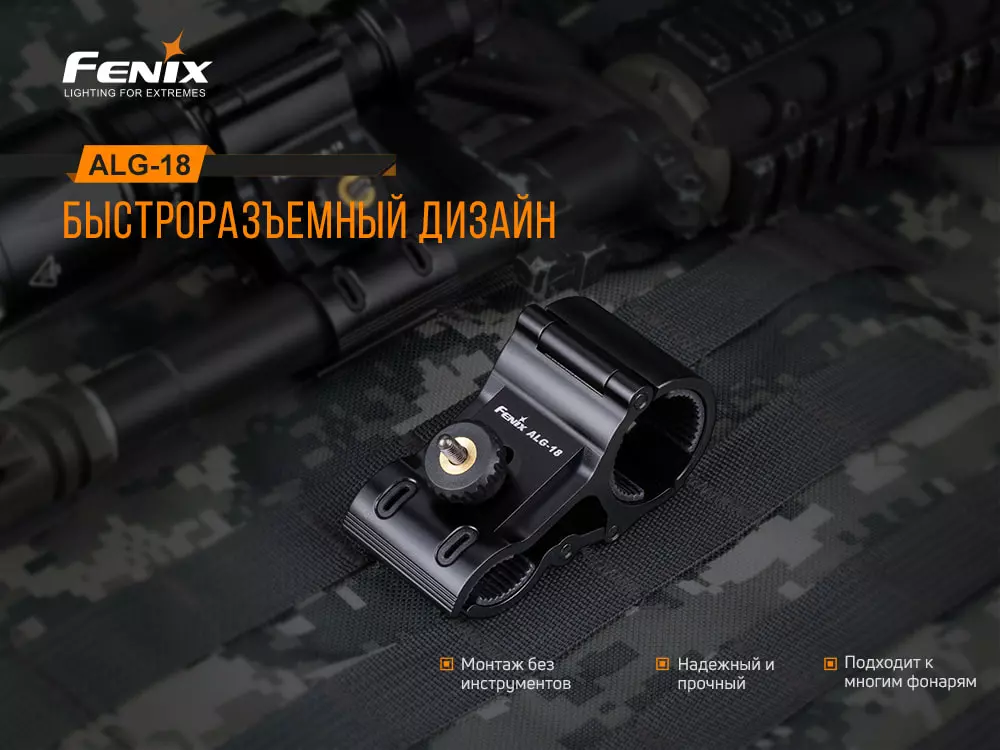 Кріплення можна швидко встановити на ствол зброї і так само швидко його зняти. Воно сумісно зі стволами різного розміру, що робить його більш універсальним і комфортним. На затиску є гумова прокладка, щоб уникнути подряпин і ефективно протистояти зовнішньому впливу, одночасно збільшуючи стабільність. Є антиблікове покриття з матовим чорним покриттям, що оптимально для тактичної маскування. При створенні Fenix ALG-18 застосовували алюмінієвий сплав а6061-Т6 разом з преміальним жорстким анодуванням. Даний матеріал і його обробка поверхні дають стійкість до пошкоджень, підвищують стійкість до зносу кріплення. В результаті воно буде служити довше користувачеві.
