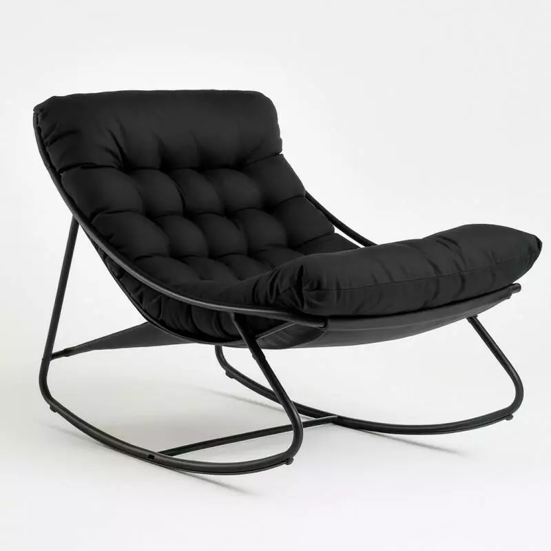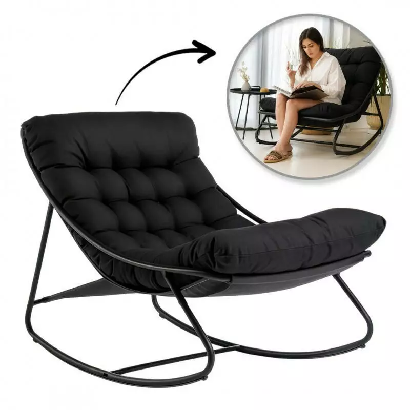 Крісло-гойдалка KR38CZ — це сучасне та зручне крісло з м’якою, прошитою оббивкою у глибокому чорному кольорі. Завдяки широкому сидінню та стійкій металевій основі крісло забезпечує максимальний комфорт та підходить як для дому, так і для тераси.