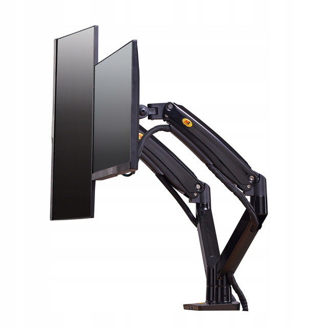Поворотне настільне кріплення для двох світлодіодних РК-моніторів з повною 3D-регулюванням і плавним регулюванням висоти на газової пружині.