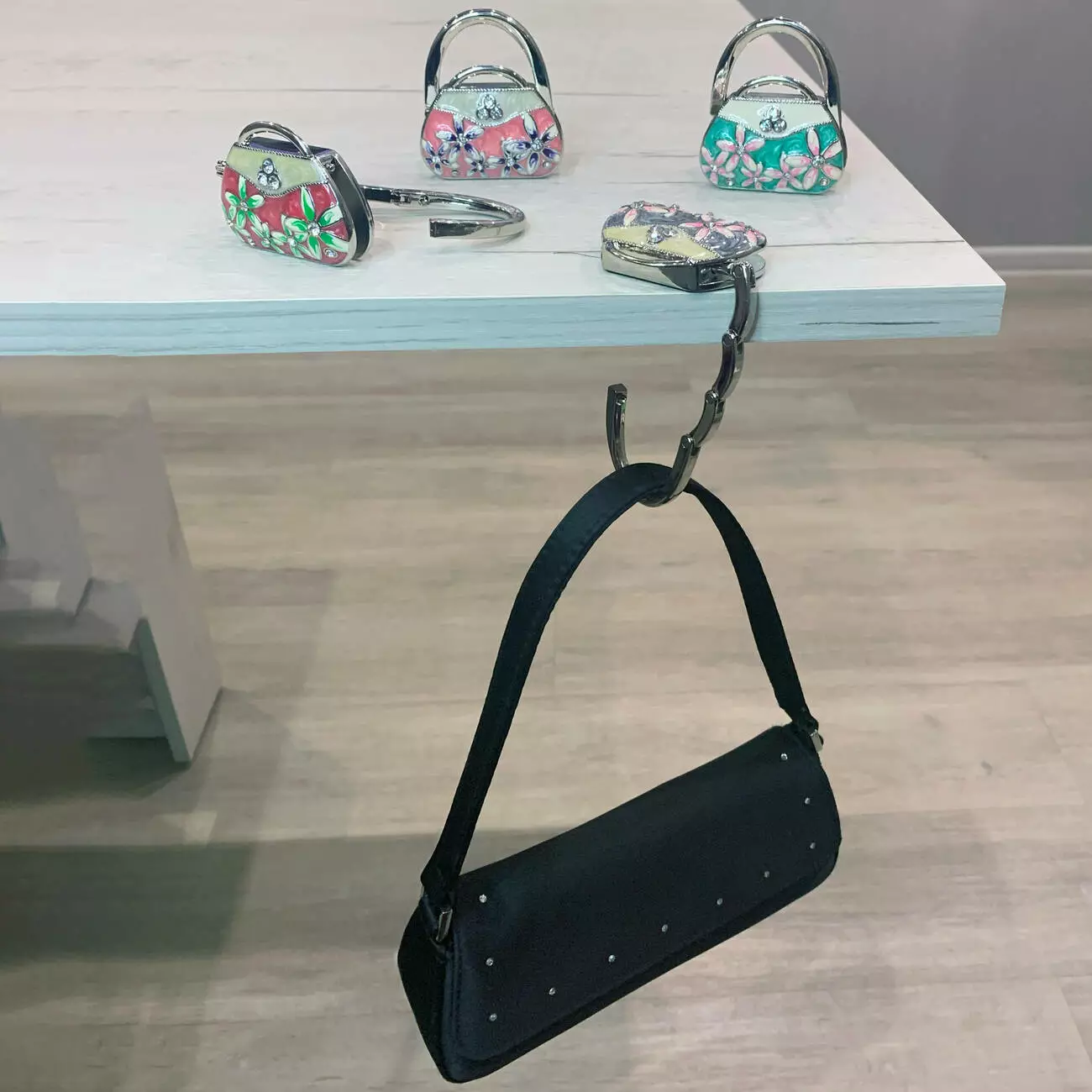 Стильный и удобный аксессуар, позволяющий аккуратно разместить вашу сумку на столе, избегая контакта с грязной поверхностью пола. Компактный, легкий и функциональный, этот крючок станет незаменимым помощником в кафе, ресторанах, офисах и других местах.