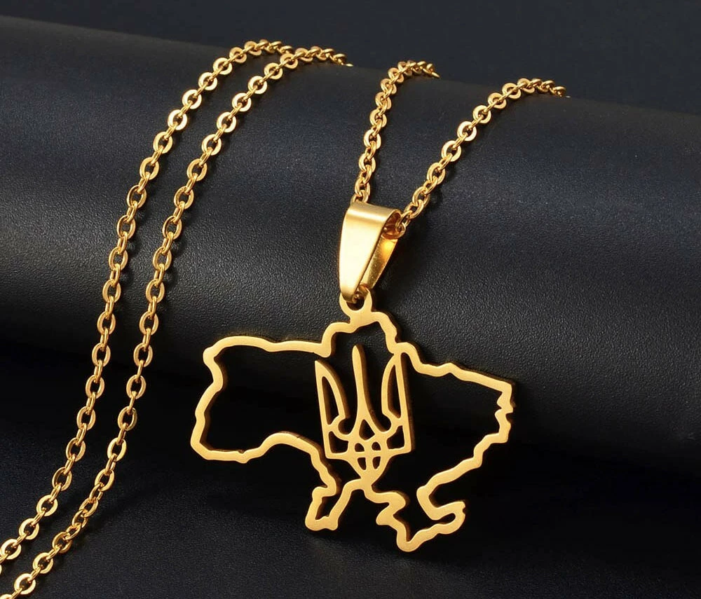 Головна > Каталог > Біжутерія та прикраси > Кулони > Кулон карта України з гербом RESTEQ золотого кольору 60 см. Підвіска у формі української картки з тризубом. Металевий кулон карта оптом