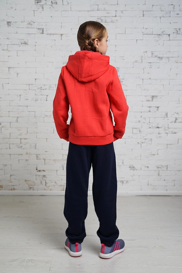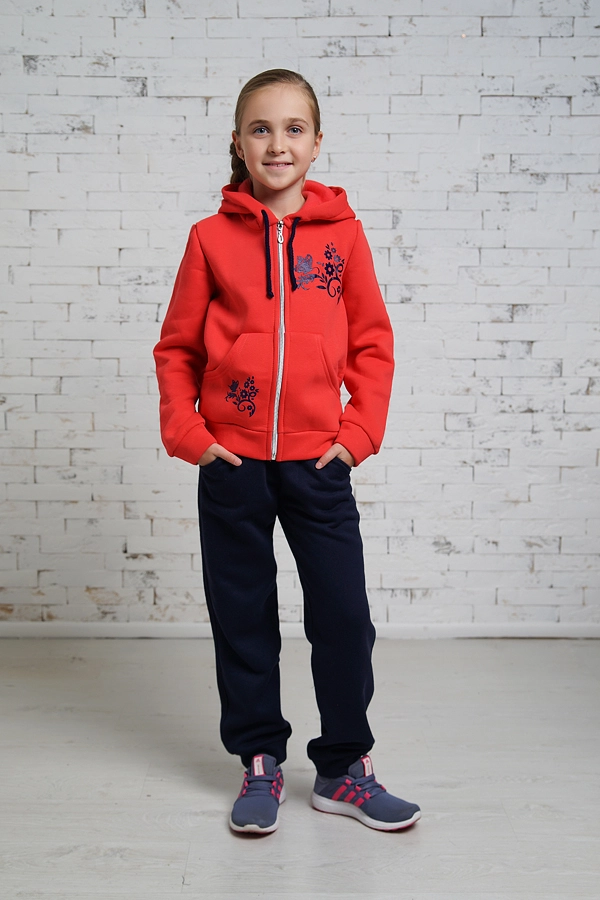 Утеплённый спортивный костюм для девочек подростков.Кофта коралового цвета,штаны-тёмно синего.Материал-трикотаж трёхнитка.