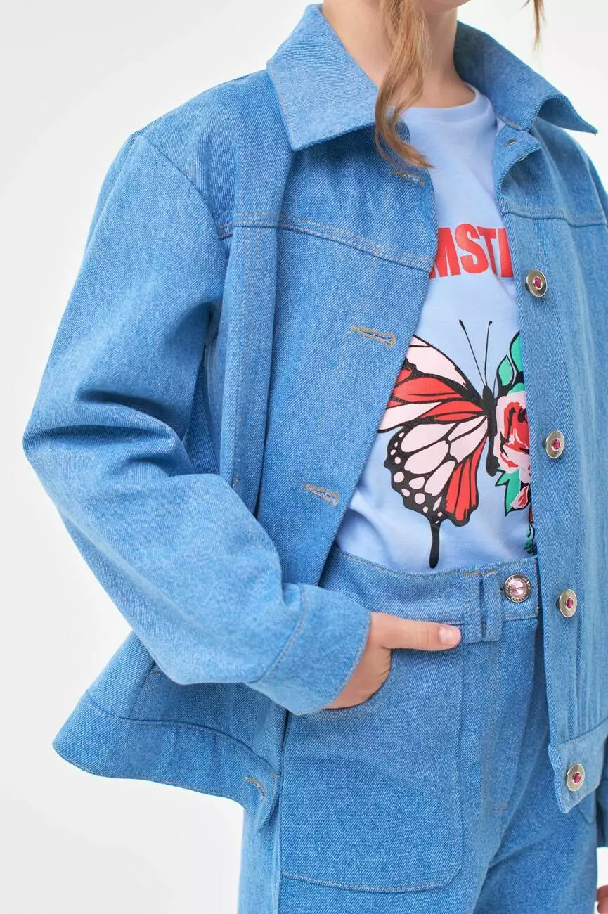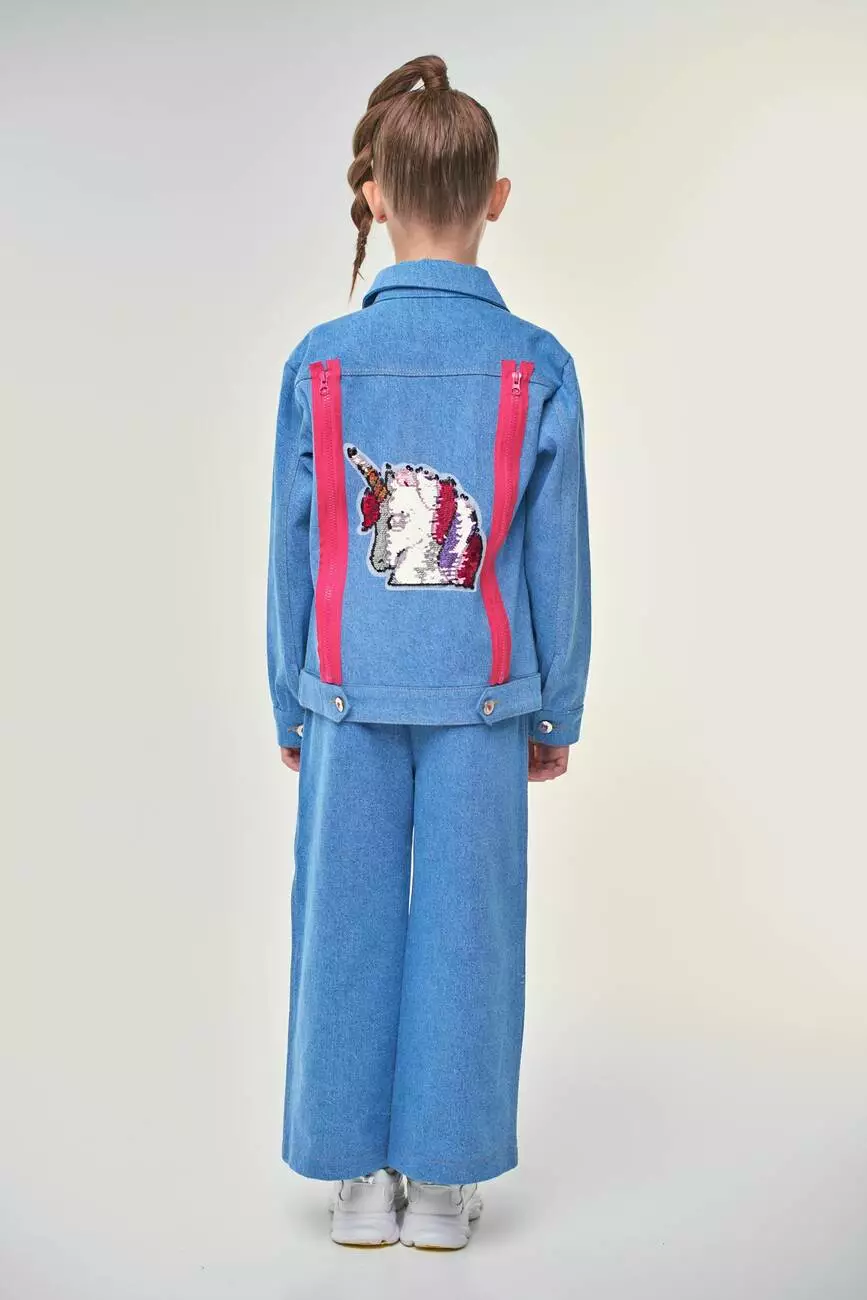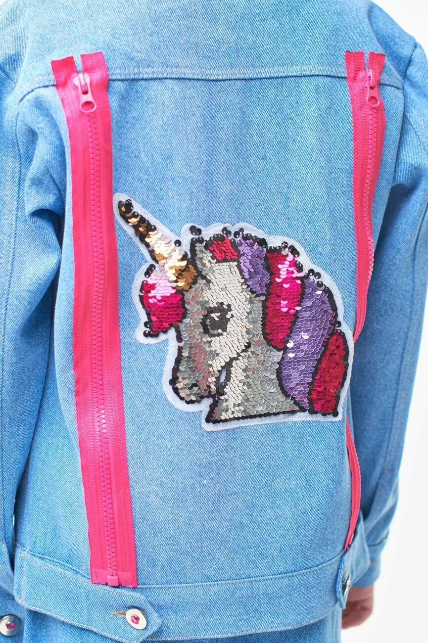 Деталі моделі: Куртка світло-блакитного кольору. Класичний крій. Застібка - на ґудзиках. Спереду і на спинці кокетки відстрочені обробною ниткою. Спереду куртки є рельєфи, в яких розташовані кишені. На спинці куртки - аплікація Єдиноріг з двосторонніх паєток, а також декоративні блискавки малинового кольору в тон аплікації. По низу виробу манжет, ззаду якого пристрочені патики, що застібаються на ґудзики. На рукавах манжети з ґудзиками. Всі шви куртки відстрочені декоративною ниткою. Склад: 95% котон, 5% еластан