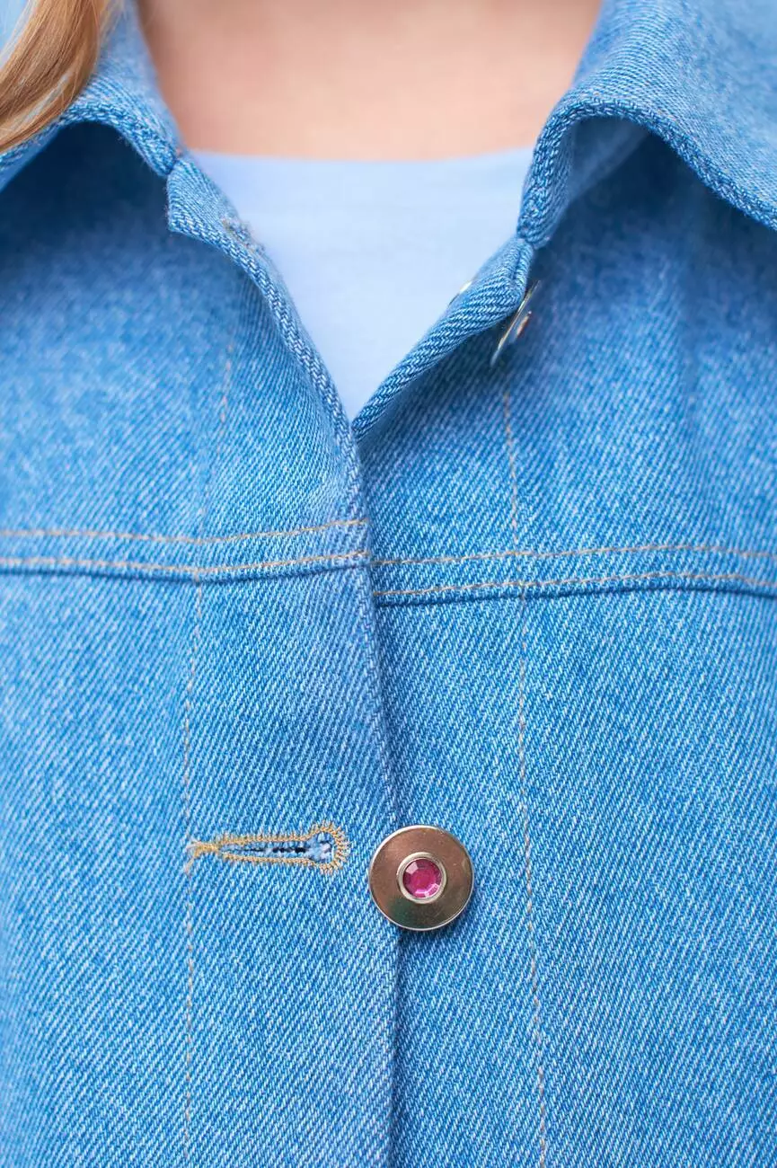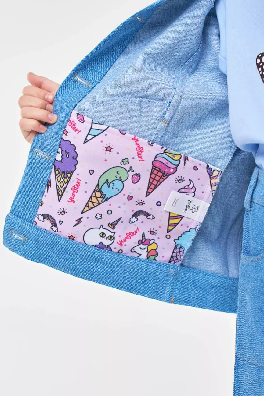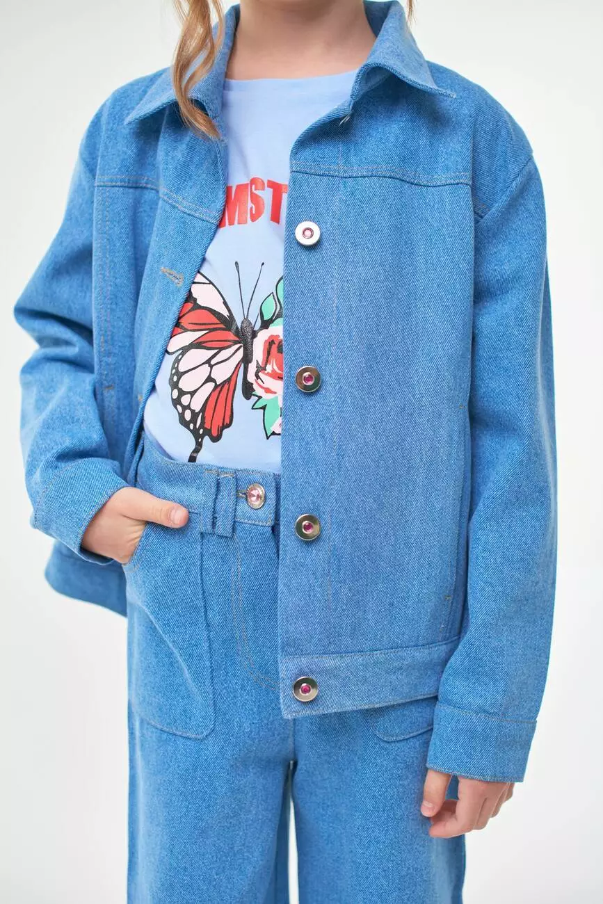Деталі моделі: Куртка світло-блакитного кольору. Класичний крій. Застібка - на ґудзиках. Спереду і на спинці кокетки відстрочені обробною ниткою. Спереду куртки є рельєфи, в яких розташовані кишені. На спинці куртки - аплікація Єдиноріг з двосторонніх паєток, а також декоративні блискавки малинового кольору в тон аплікації. По низу виробу манжет, ззаду якого пристрочені патики, що застібаються на ґудзики. На рукавах манжети з ґудзиками. Всі шви куртки відстрочені декоративною ниткою. Склад: 95% котон, 5% еластан