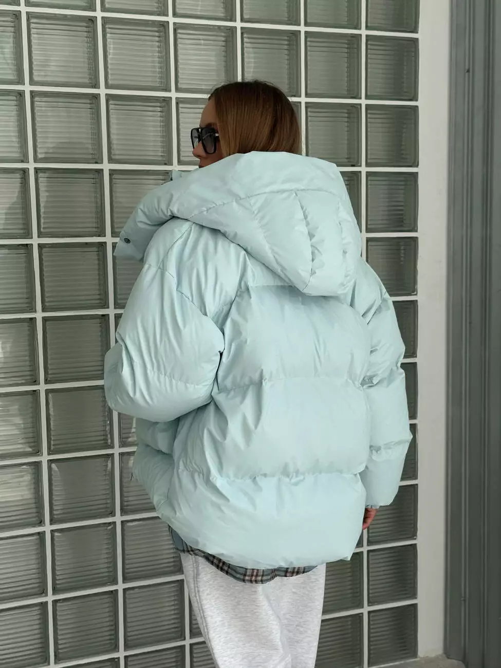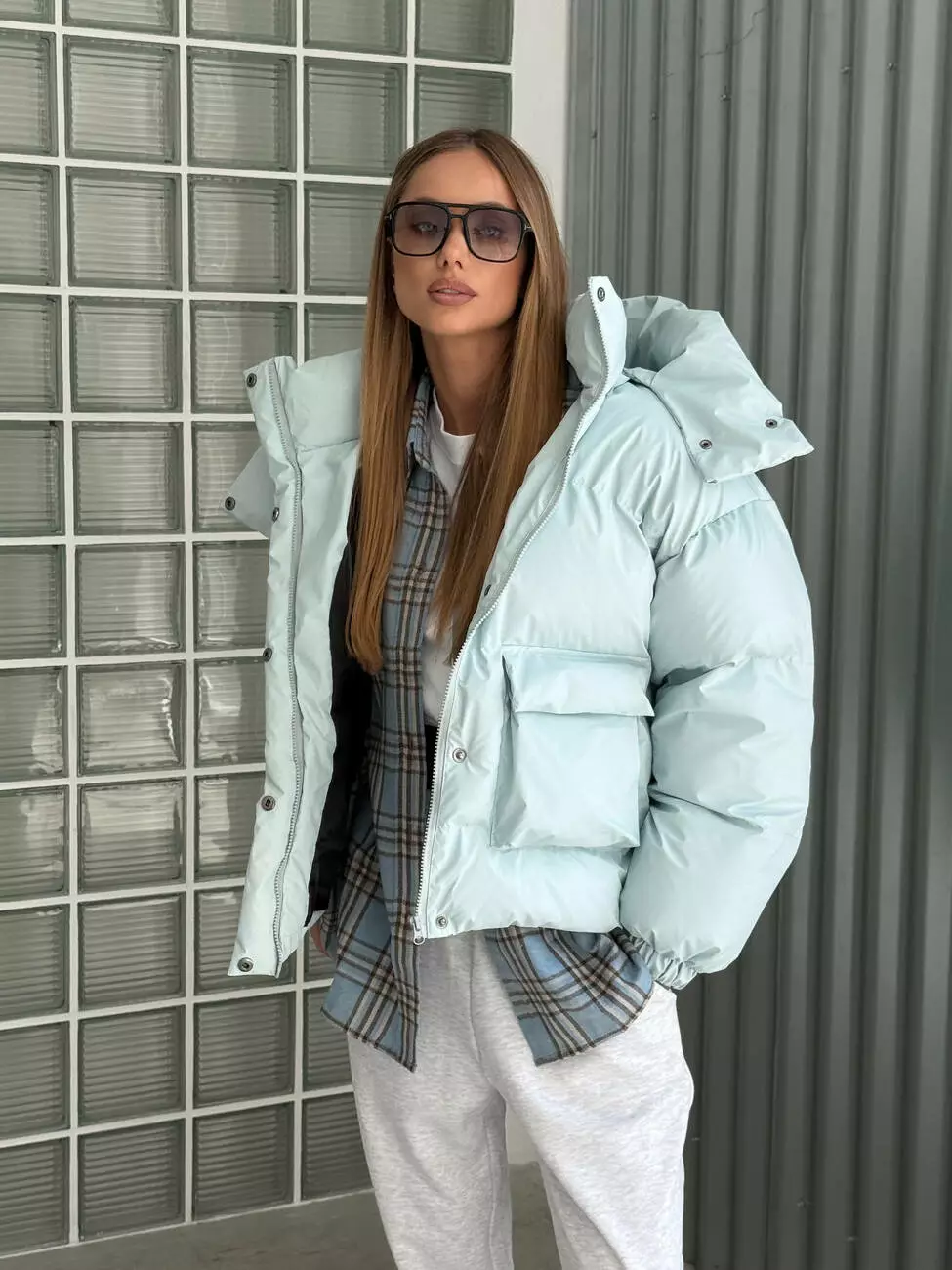 Зимовий укорочений пуховик, виконаний з плащівки на мембрані, що є непродувною і водонепроникаючою. Капюшон знімається