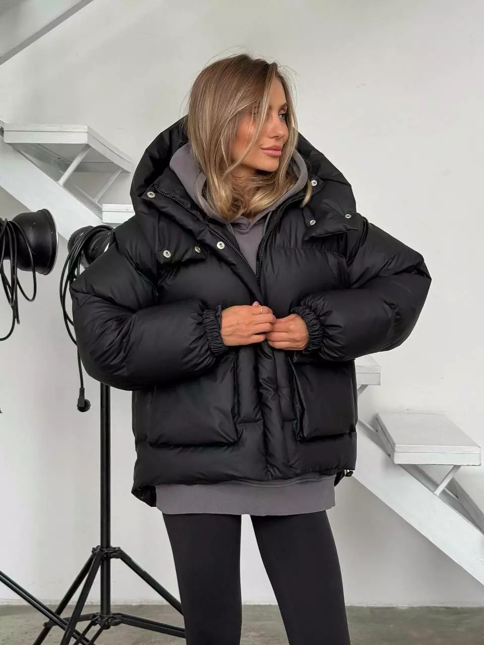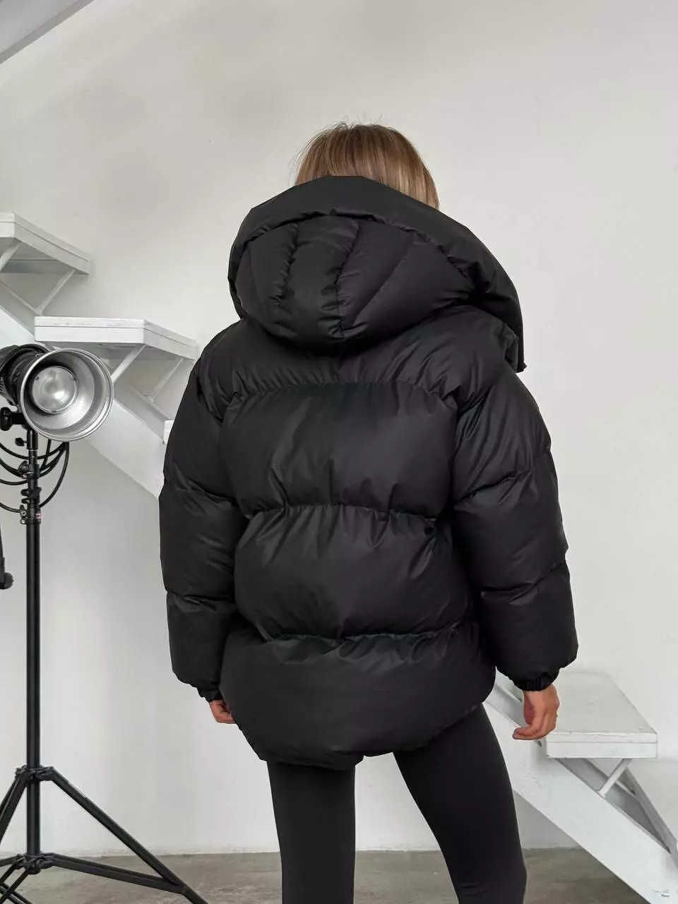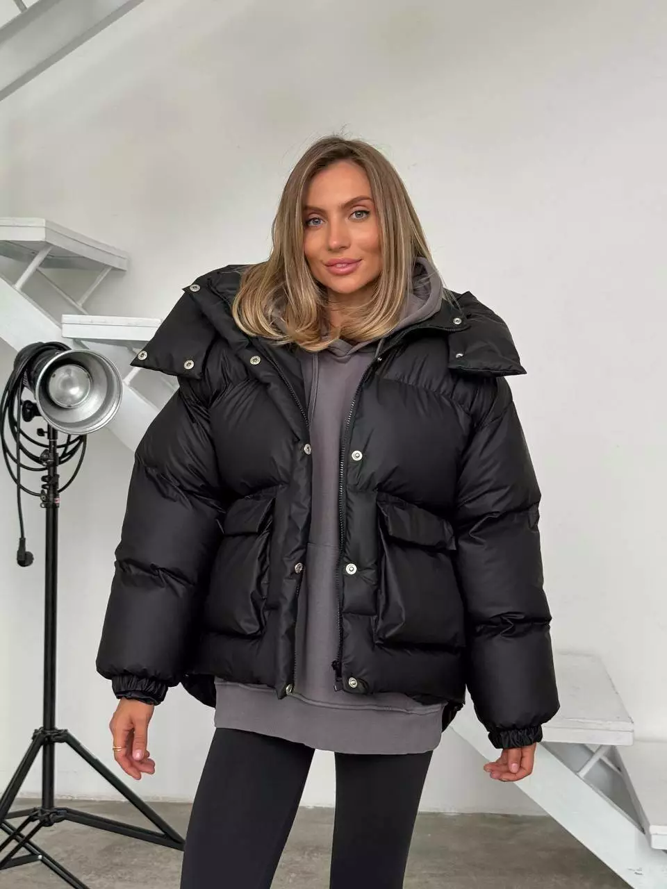 Зимовий укорочений пуховик, виконаний з плащівки на мембрані, що є непродувною і водонепроникаючою. Капюшон знімається