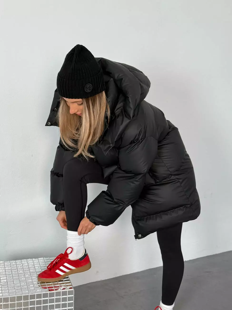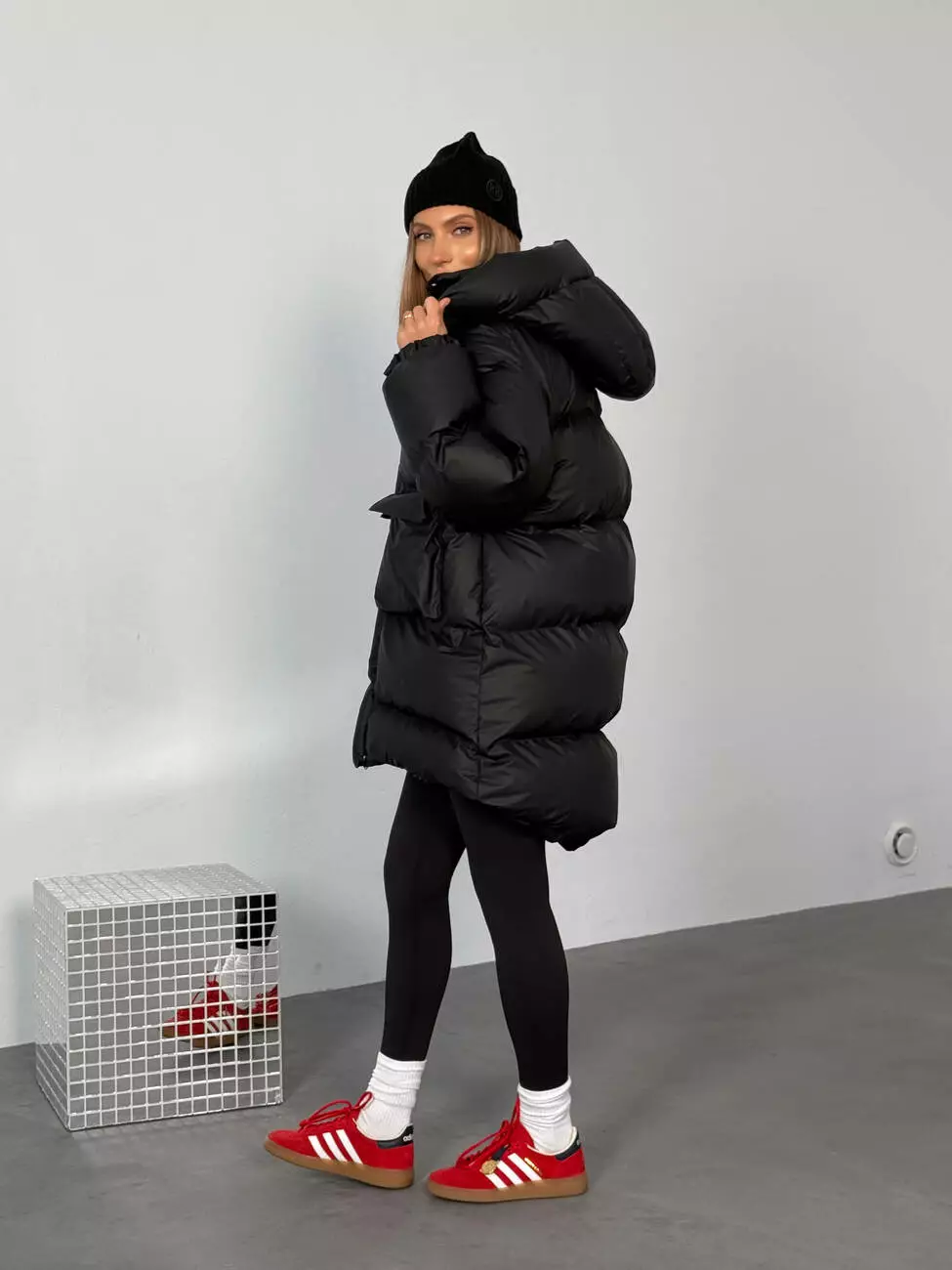 Зимовий подовжений пуховик, виконаний з плащівки на мембрані, що є непродувною і водонепроникаючою. Капюшон знімається