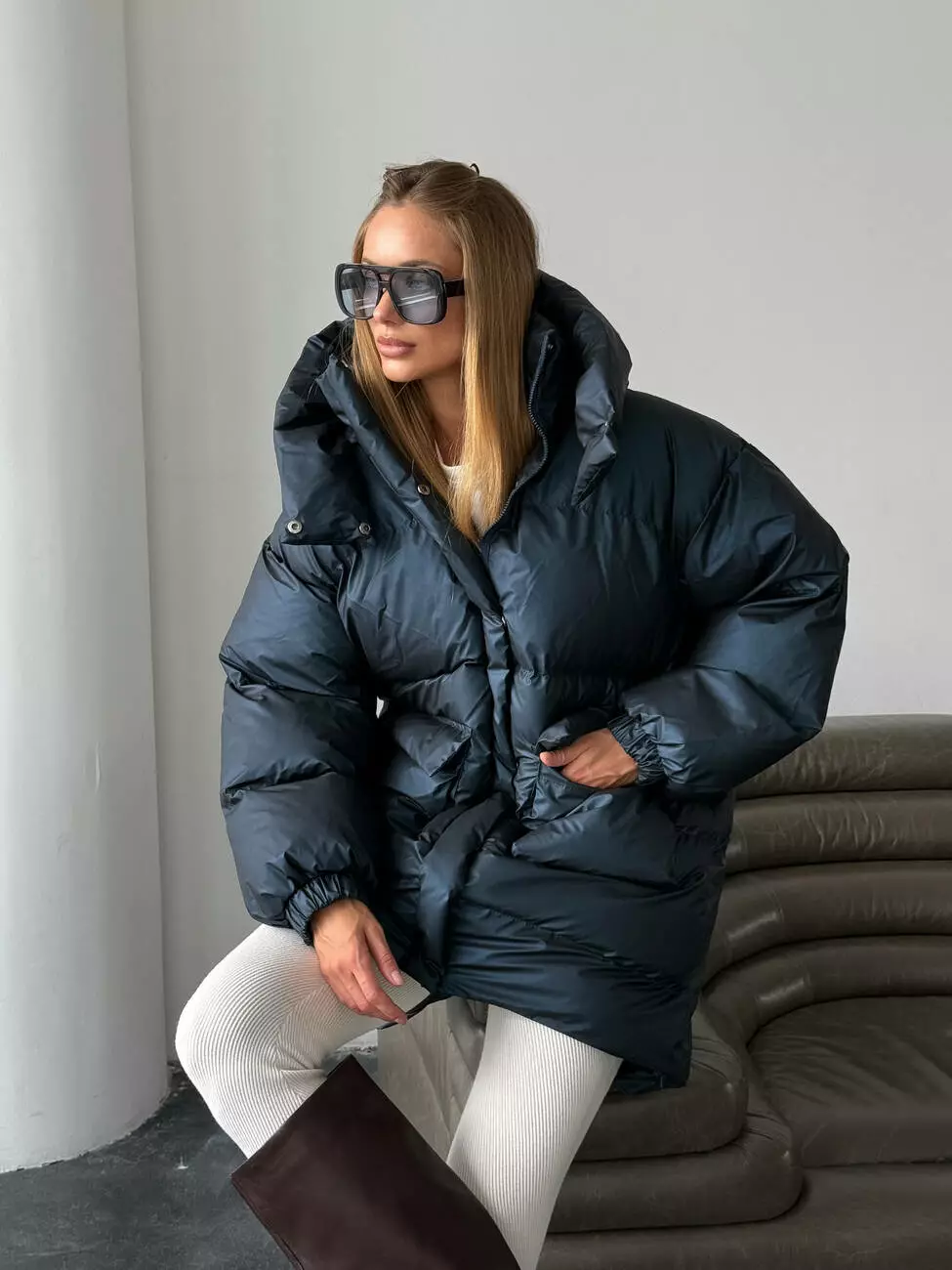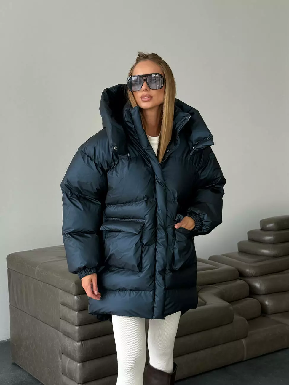Зимовий подовжений пуховик, виконаний з плащівки на мембрані, що є непродувною і водонепроникаючою. Капюшон знімається
