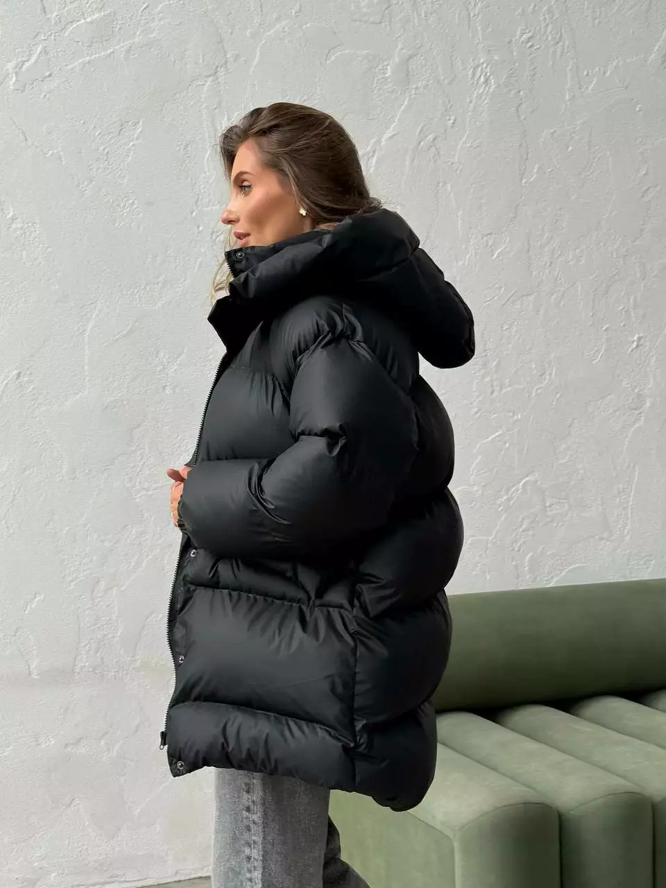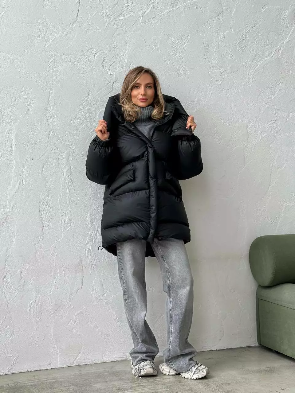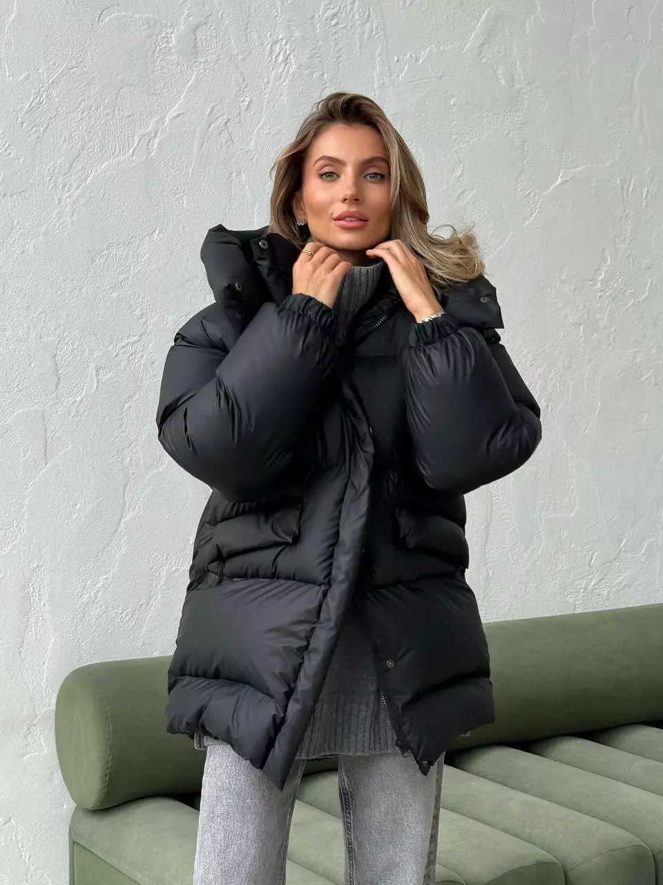 Зимовий подовжений пуховик, виконаний з плащівки на мембрані, що є непродувною і водонепроникаючою. Капюшон знімається