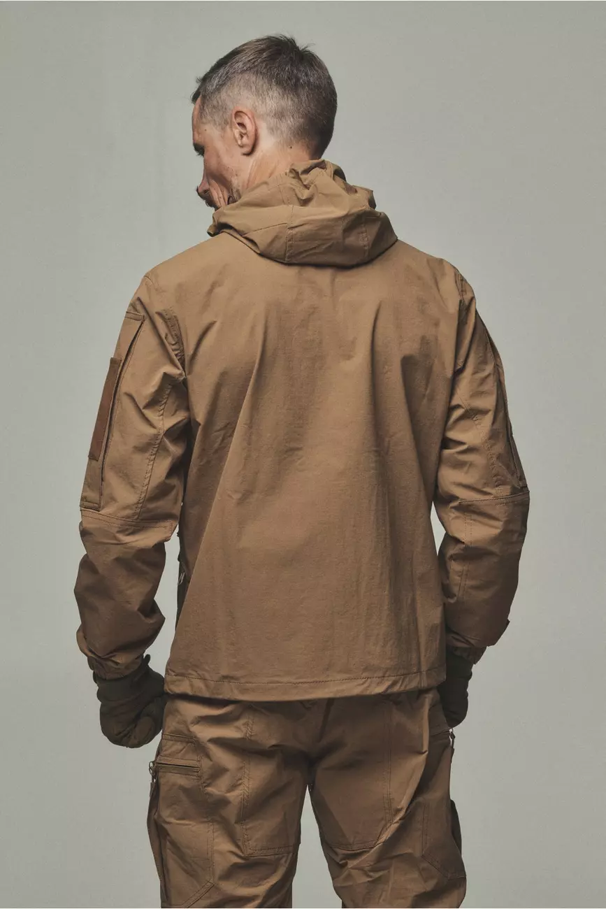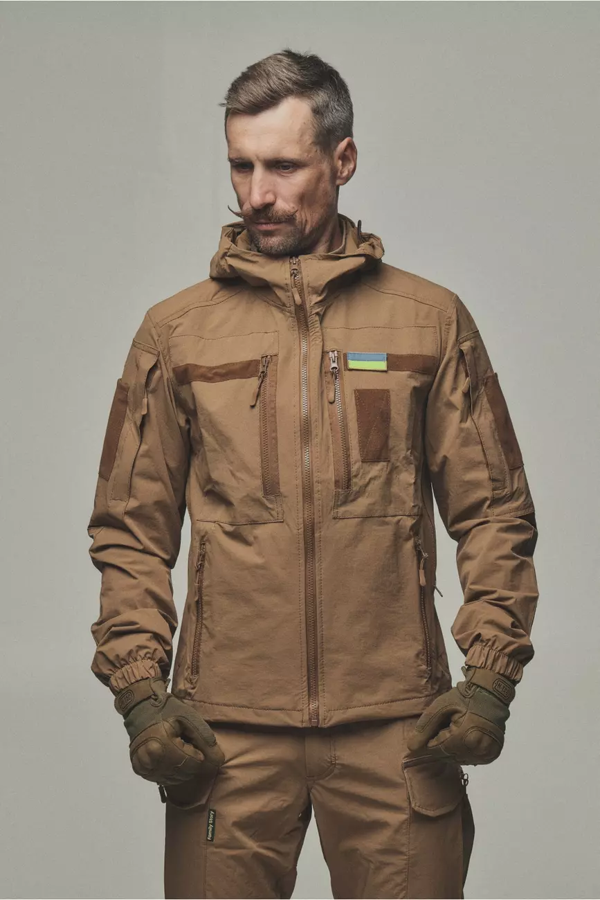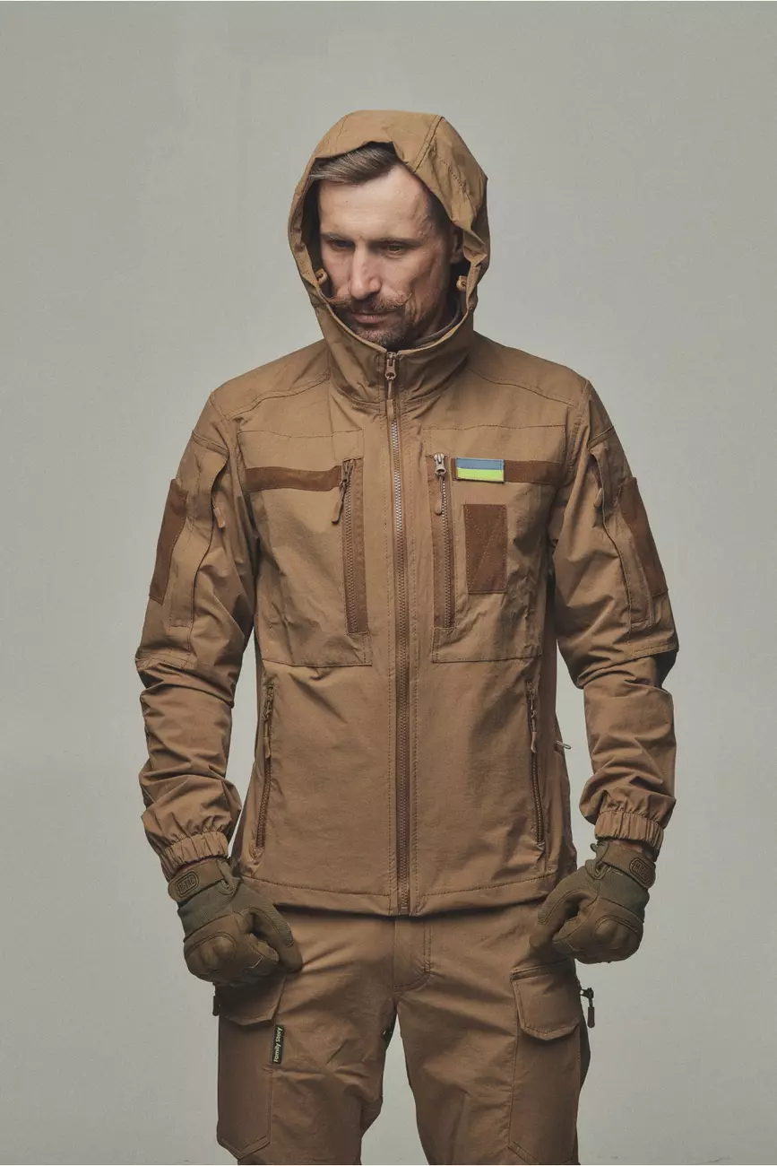 Куртка яка розтягується та не сковує рухи, не пропускає вологу та одночасно дихає. Куртка має 6 кишень, капюшон, шеврони, на манжеті гумка для щільного прилягання та провітрювані кишені з сіткою під пахвами якщо треба знизити температуру після навантаження. Якісна фурнітура та тканина рівня ТОП робить цей виріб унікальним при використані та майже не має аналогів!
