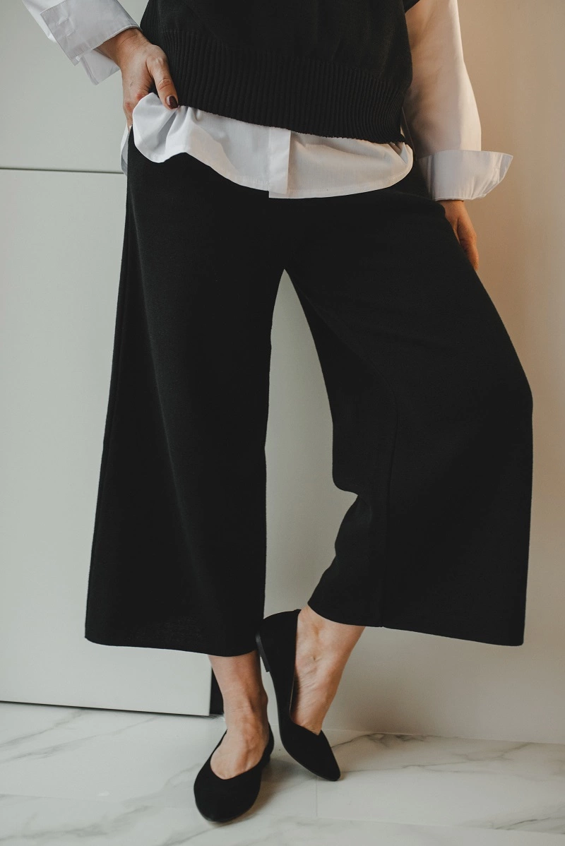 Модные трикотажные кюлоты отлично садятся на любую фигуру. Стильно выглядят как с туфлями, так и с кроссовками.