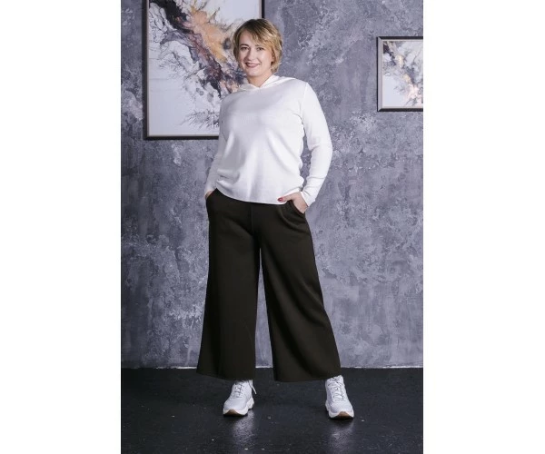 Модные трикотажные кюлоты отлично садятся на любую фигуру. Стильно выглядят как с туфлями, так и с кроссовками.