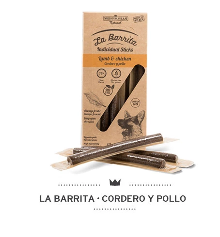 La Barrita М'ясні палички для собак з куркою та ягням La Barrita з MEDITERRANEAN NATURAL - це гіпоалергенні ласощі преміум якості. Виготовлені в Іспанії. Не містять глютену, штучних барвників та ГМО. Збагачені Омега 3, Омега 6 та олеїновою кислотою. 12 шт / упаковка, кожна паличка окремо завакуумована. Склад: М'ясо 75% (30% м'ясо курки, 25% м'ясо ягняти, 15% хамон, 5% м'ясо яловиче), рис. Харчові добавки: олія орегано, розмарин. Добова норма годівлі: Маса тіла тварини: 1-10 кг - до 2 штук 11-20 кг - до 3 штук 21-30 кг - до 5 штук Більше 30 кг - до 6 штук