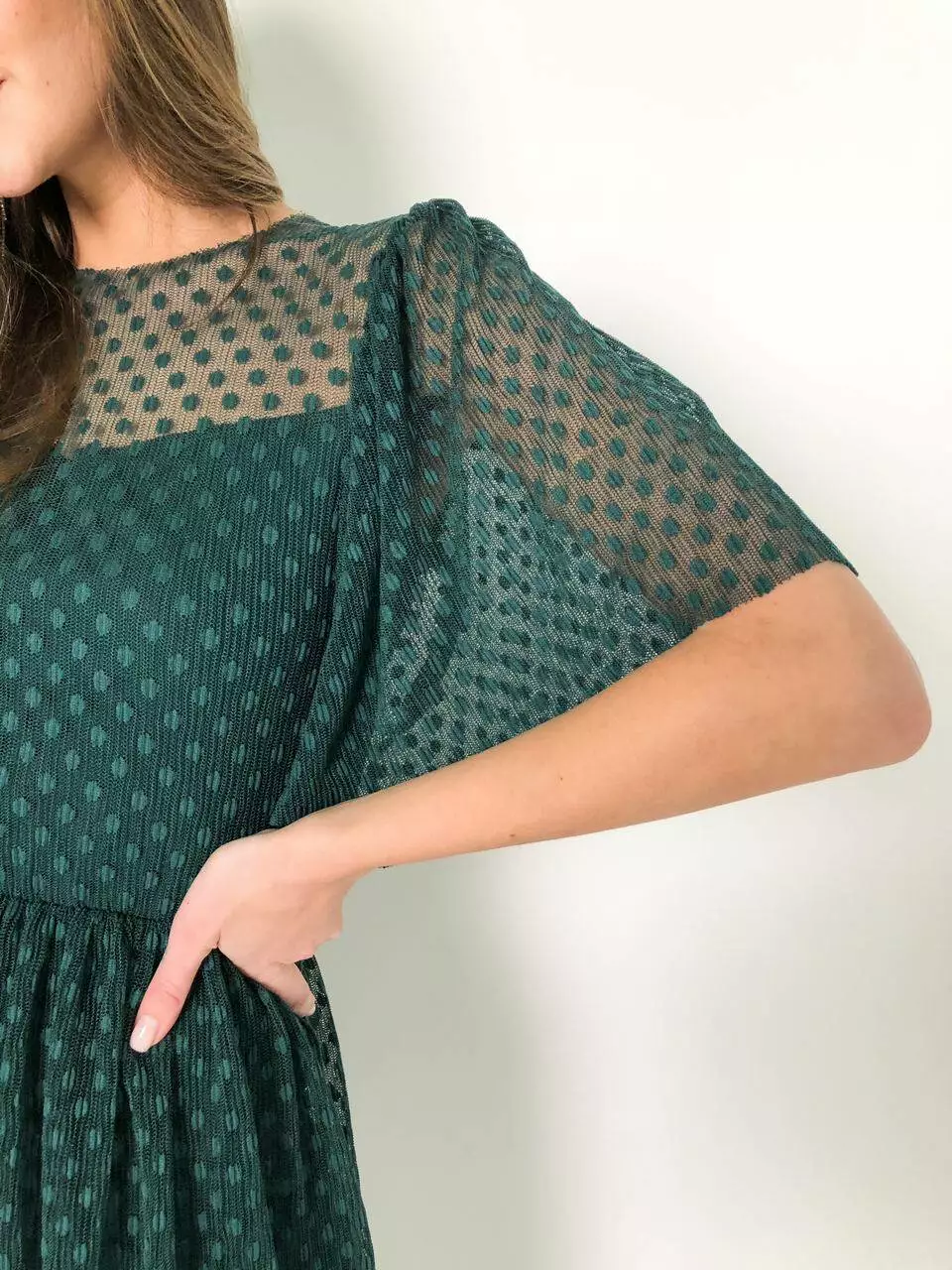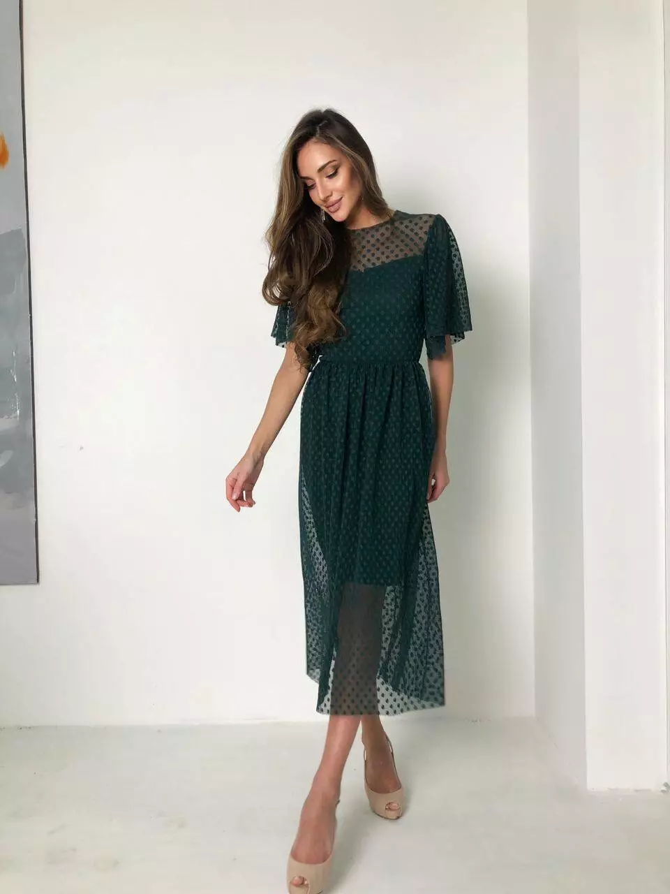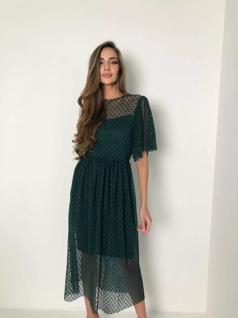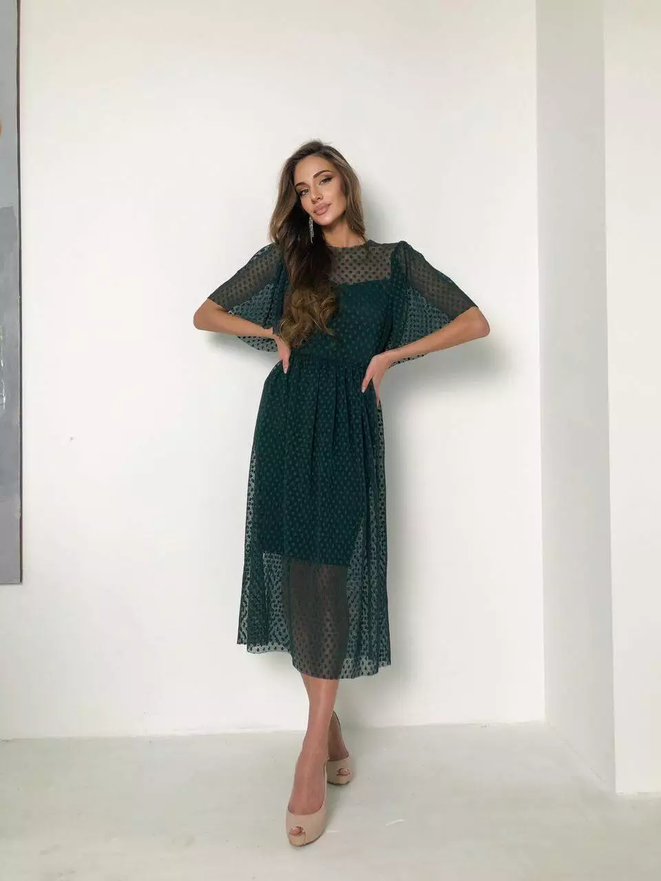 Лаконічна ошатна сукня додасть вашому образу жіночності, підкреслить витончений смак і дотримання сучасних тенденцій. Стриманий фасон компенсується цікавою тканиною, що використовується - сіткою-гофре з трендовим горошком. Широкий рукав і довжина міді з сітки надають легкості сукні, а вашому образу легкості, романтичності.
