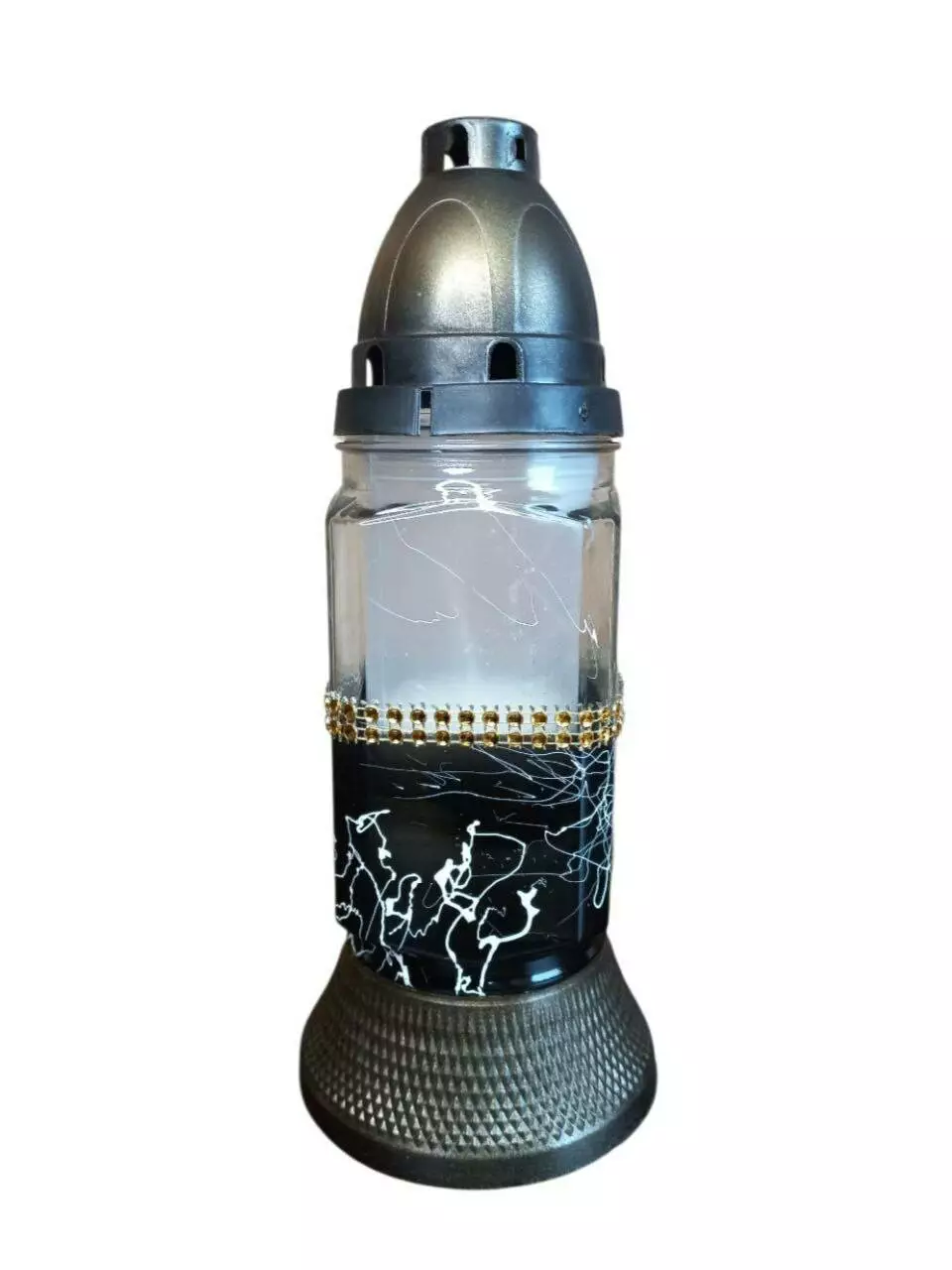 Лампадка нитка виготовлена зі скла, з пластиковою кришечкою та пластиковою підставкою. Висота 240 мм, час горіння парафінової запаски - 36 годин.
