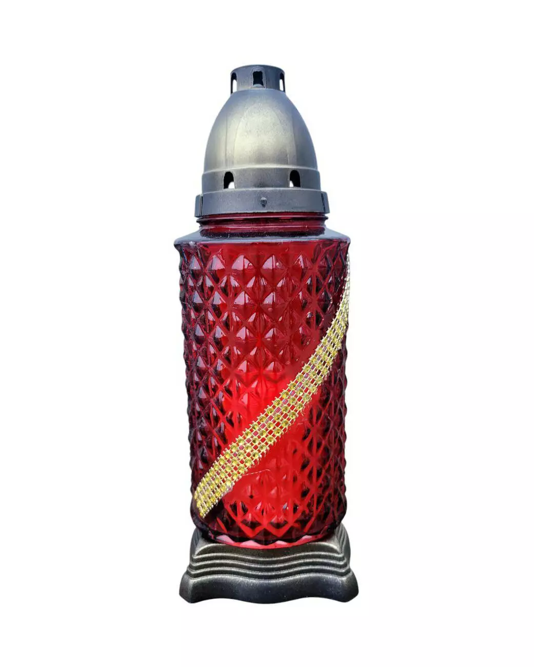 Лампадка хрест на овалі виготовлена зі скла, з пластиковою кришечкою та пластиковою підставкою. Висота 270 мм, час горіння парафінової запаски - 48 годин, червоного коліру.