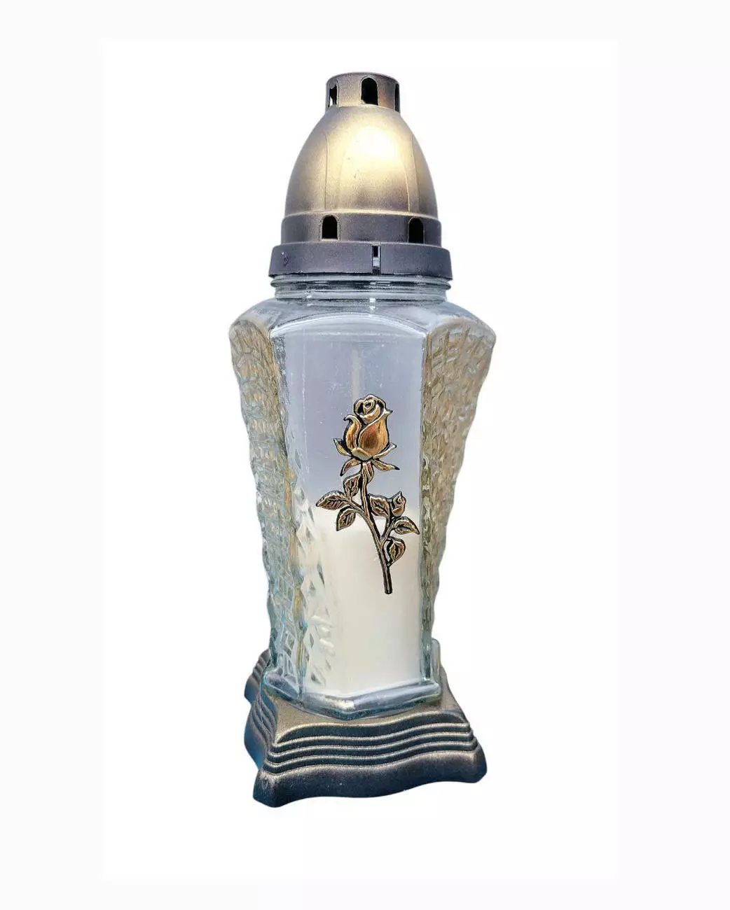 Лампадка троянда виготовлена зі скла, з пластиковою кришечкою та пластиковою підставкою. Висота 270 мм, час горіння парафінової запаски - 48 годин.