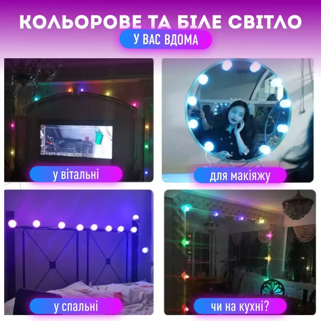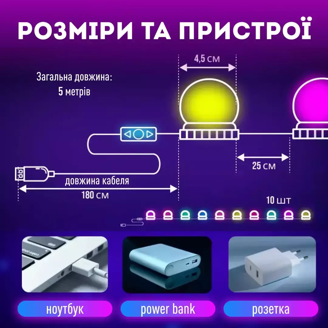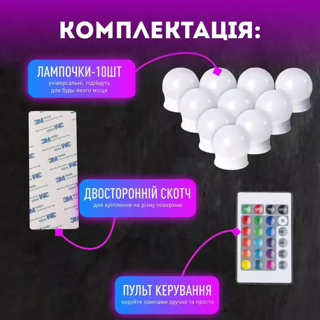10 ламп, Регулятор яркости и цветового режима, Липучки – 10 шт,; Инструкция