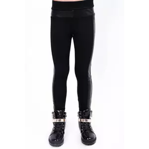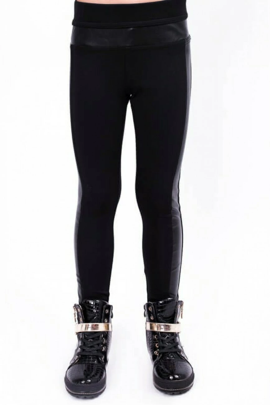 Широкий пояс-резинка, металлические заклепки и два накладных кармана сзади придают модели схожесть по фасону с узкими брюками «скинни». Благодаря этому леггинсы будут отлично смотреться практически с любым верхом. Оригинальность модели придают детали из экокожи – лампасы на штанинах и вставка на поясе под резинкой.