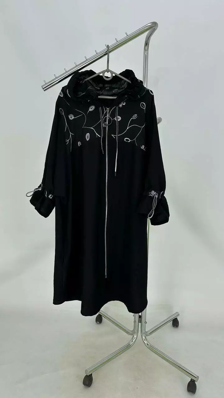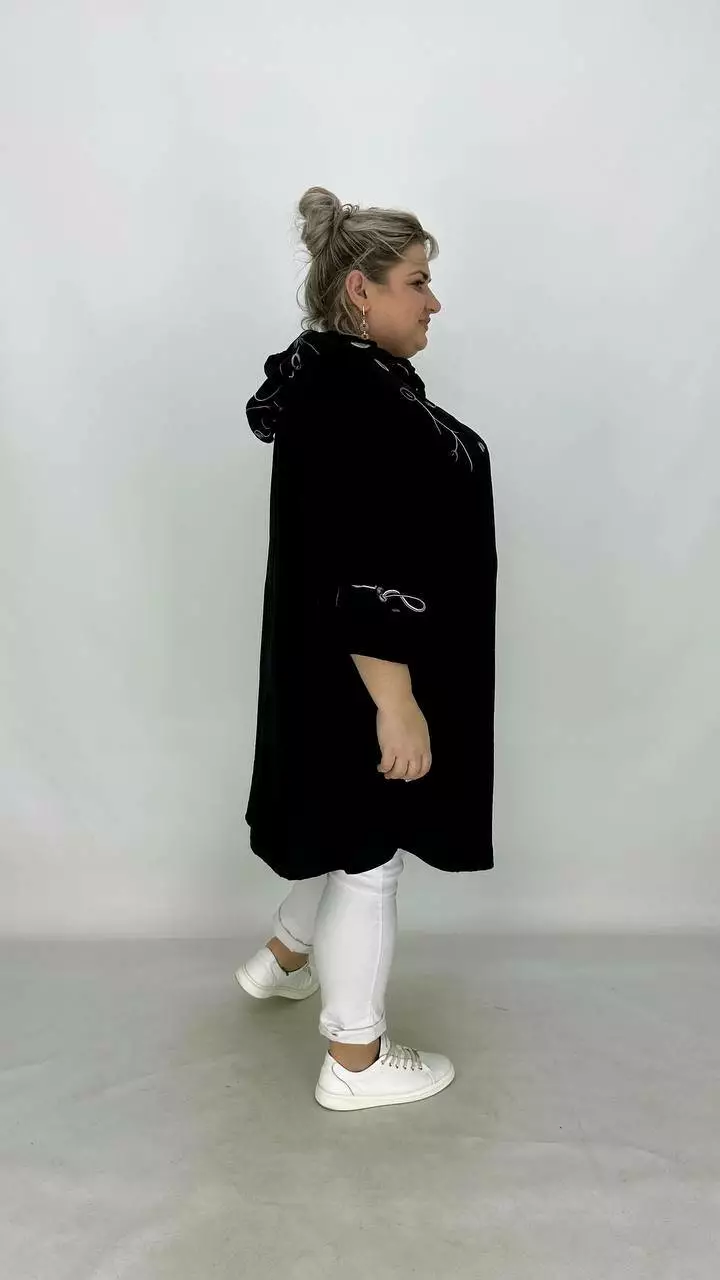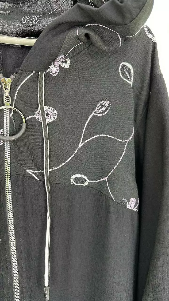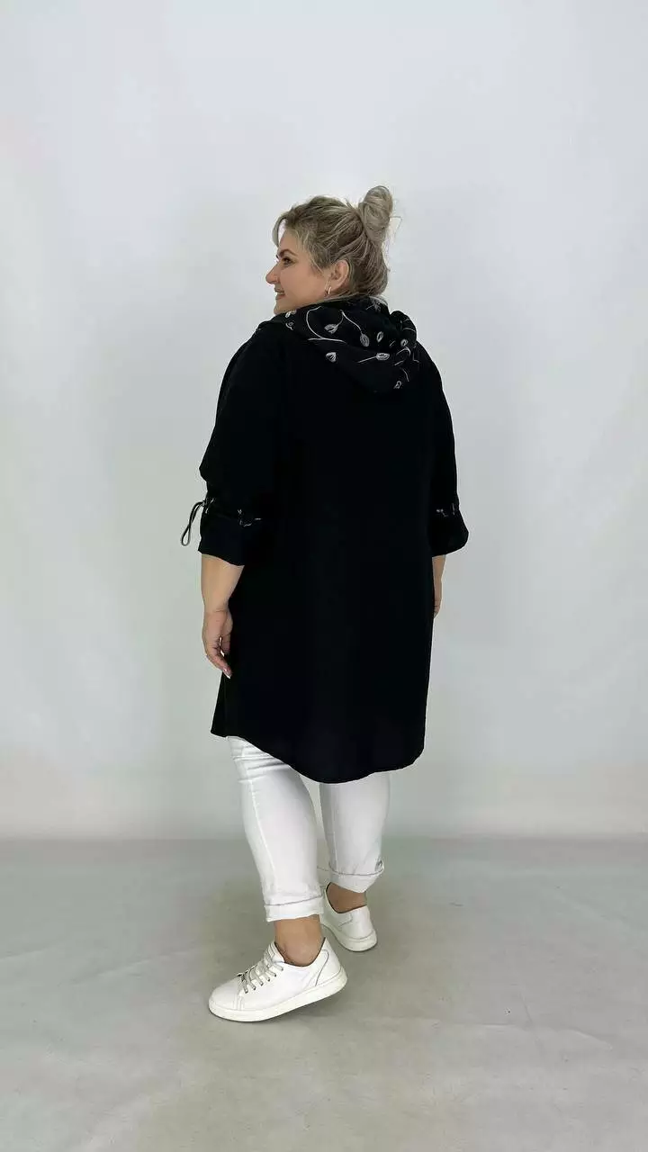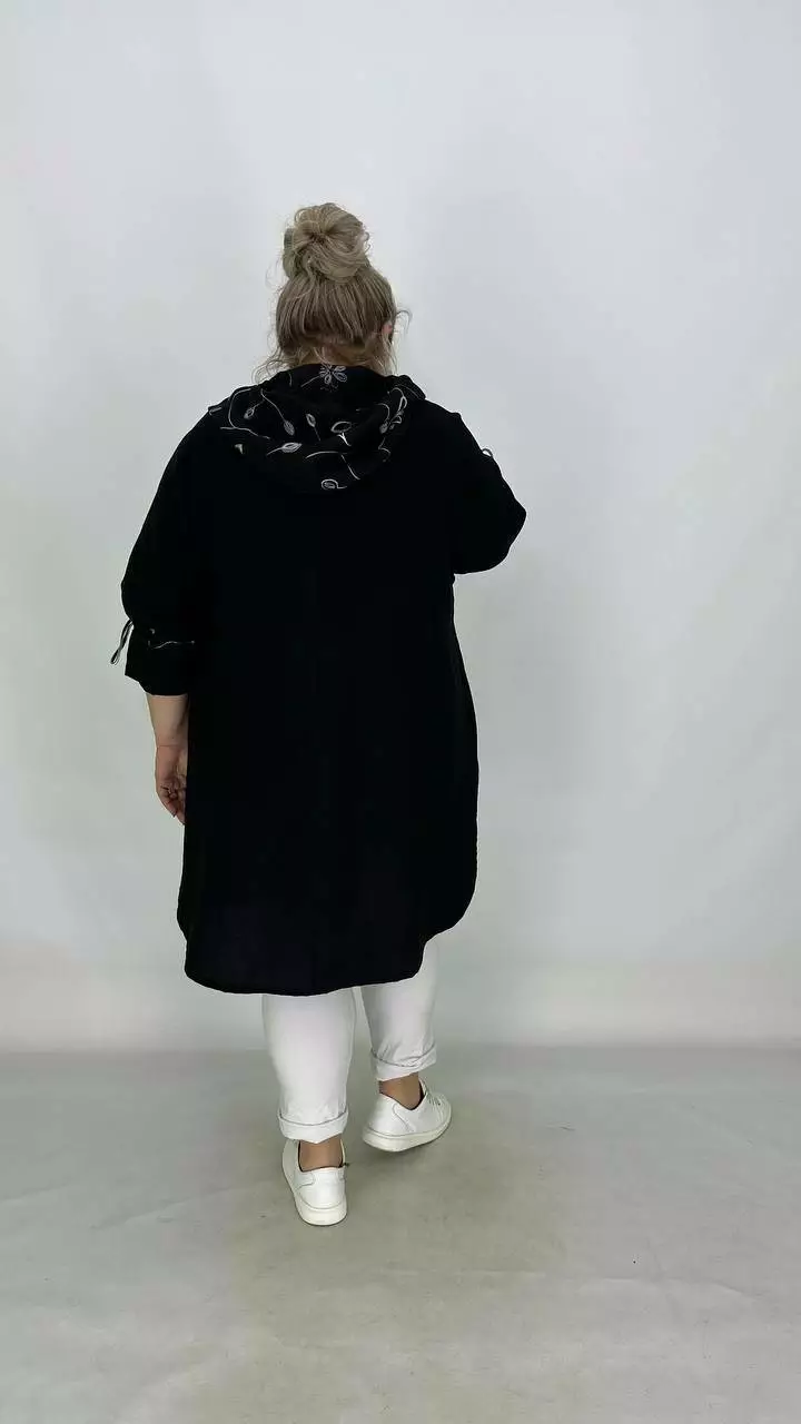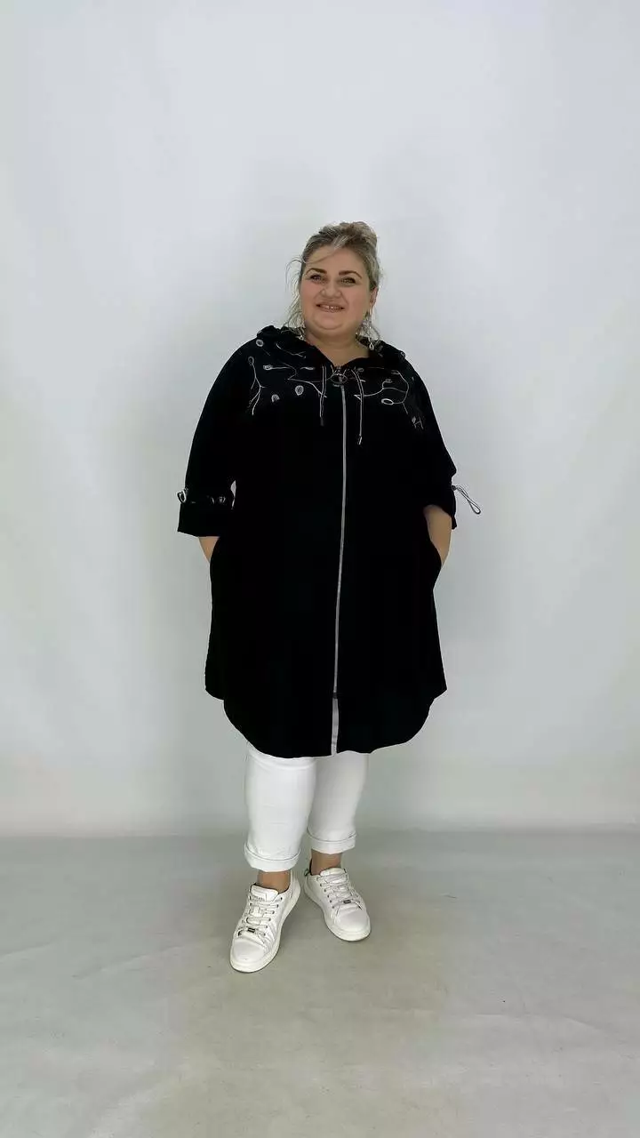 Легкий пильовик із жатого льону, комбіновано з льоном вишивка. Силует вільний зі спущеною проймою, трапеція, рукав на лаштунці, кишені в бічних швах, застібка блискавка. з капюшоном.