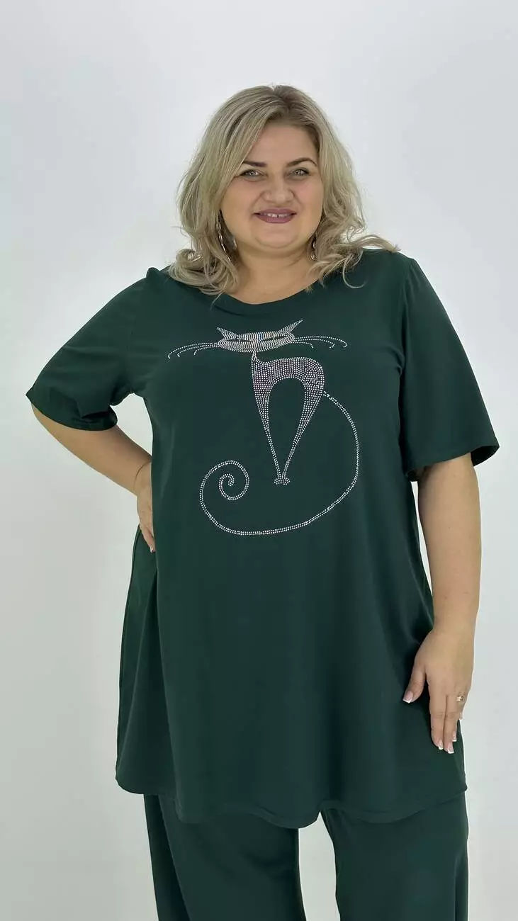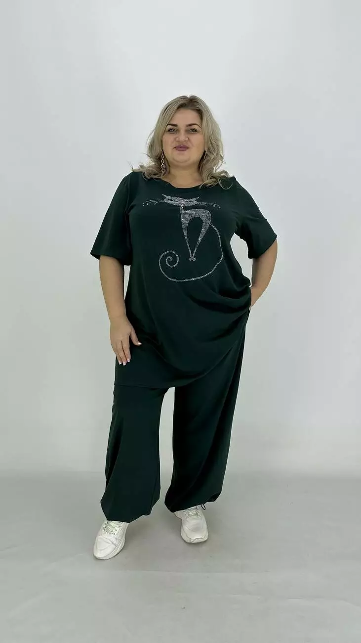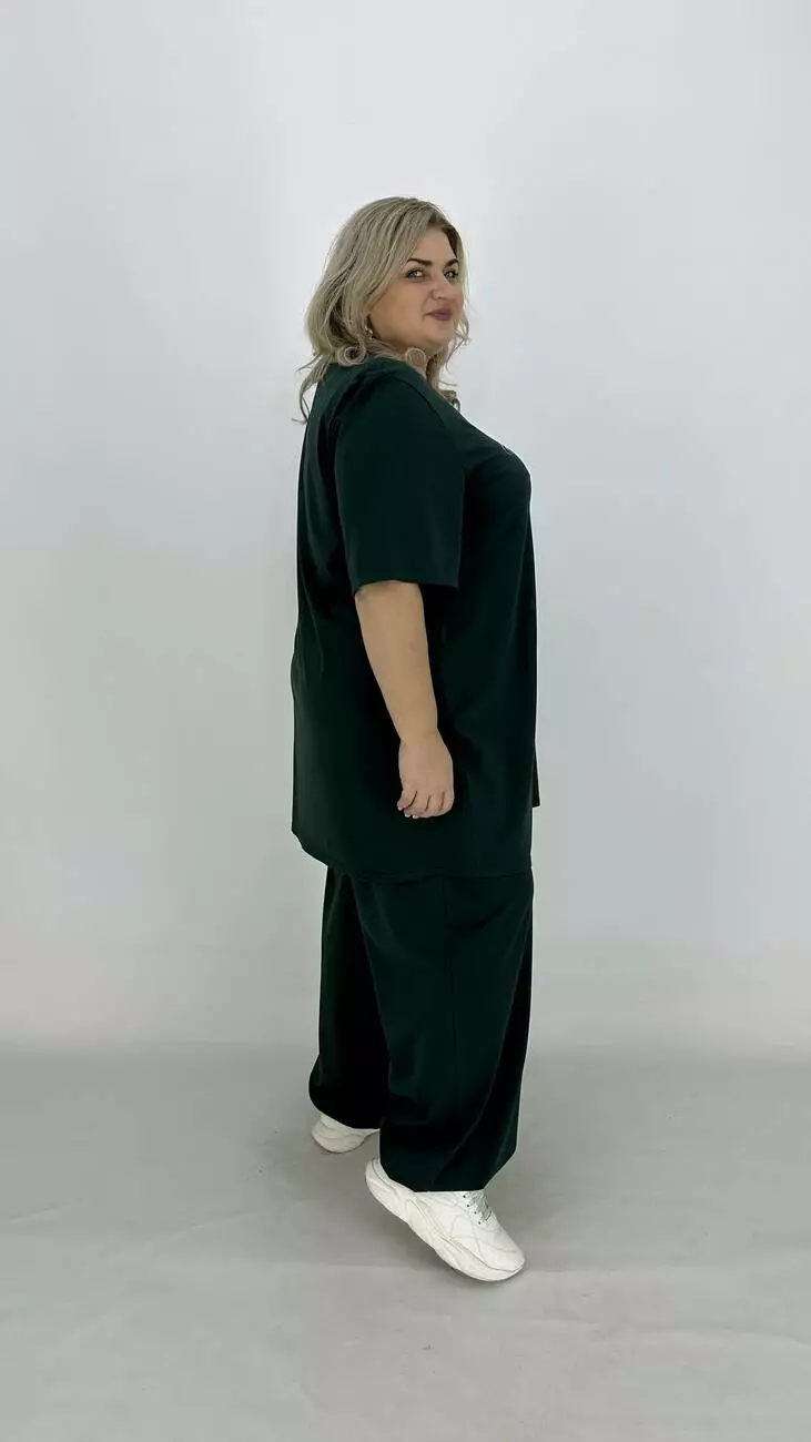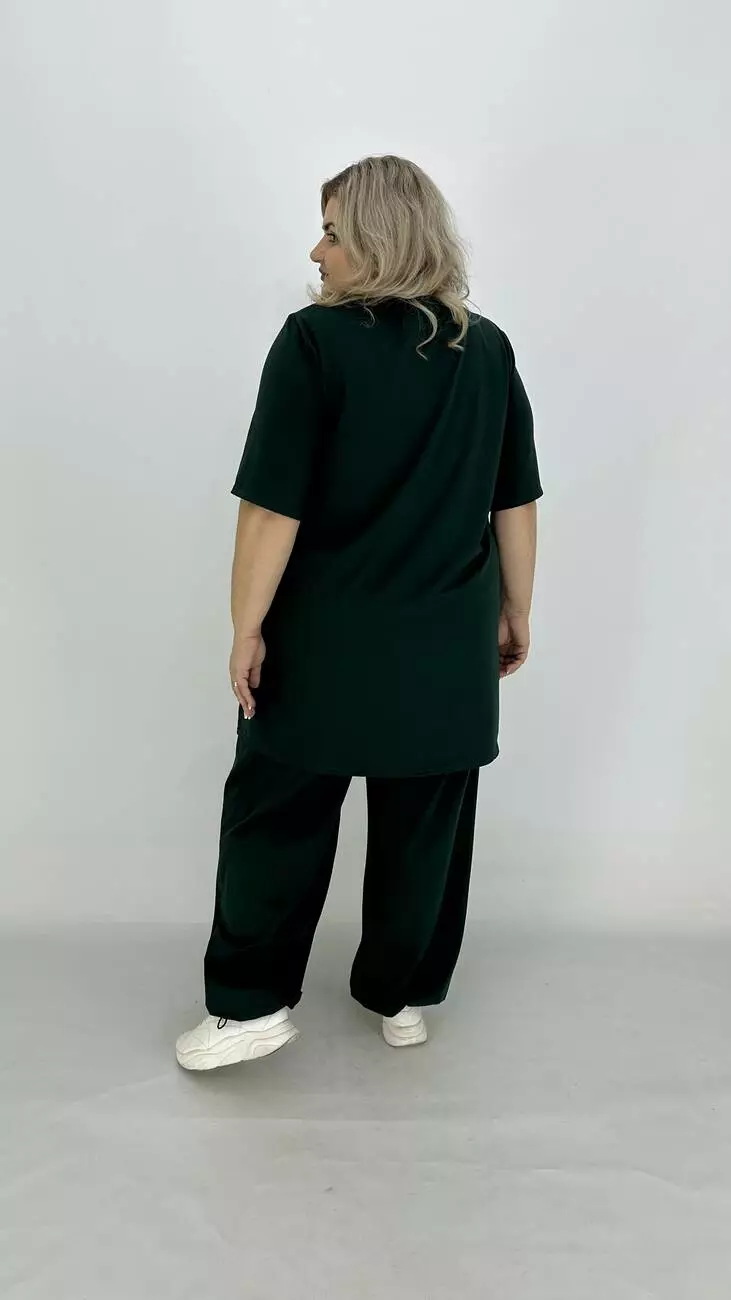 Легкий костюм з куліра, люкс якості п/в Туреччина. Тканина бавовна з еластаном гарної розтяжності, м'яка тонка і дуже приємна до тіла, не кашлатиться, не пом'якшується, не витягується, тримає форму. Футболка подовжена та розкльошена, з якісним кам'яним накатом. Штани широкі, внизу регулюються на гумці, з кишенями, зручна висока посадка.