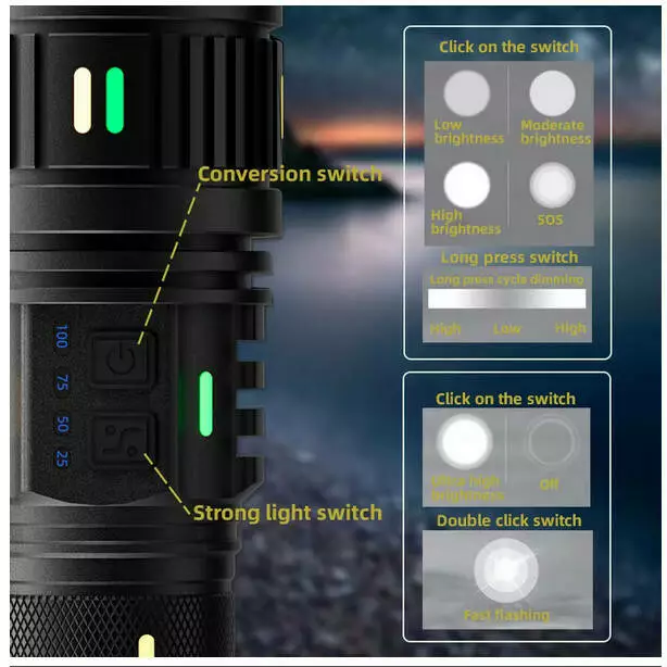 Кількість режимів роботи: 5 (100%, 70%, 50%, стробоскоп, SOS)