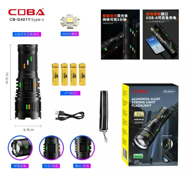 фонарь, 4x18650 аккумулятора, кабель USB-Type-C